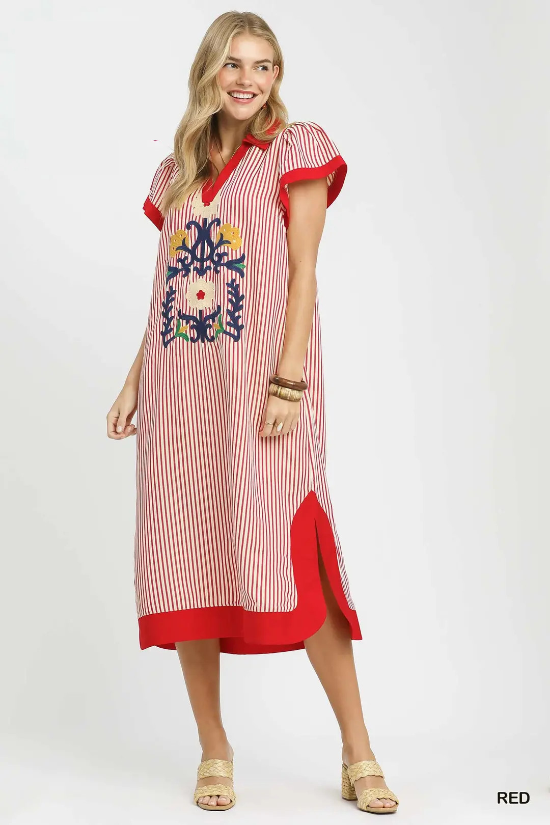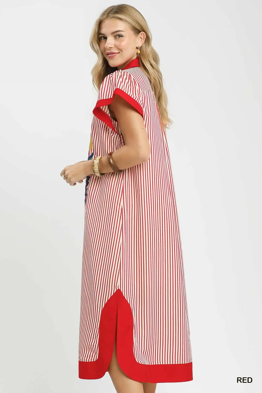 This stripe dress showcases exclusive multicolor floral embroidery that infuses artistic charm into its classic striped pattern. It features a neat collared V-neckline for a polished touch, paired with short sleeves finished with contrast trim that enhances its visual appeal. Designed with a relaxed caftan silhouette and side slits, it ensures airy comfort and unrestricted movement. Fully lined for softness and coverage, this piece combines bold graphic stripes with delicate artisan embroidery, making it perfect for vacations, beach outings, brunch, and casual daytime events.