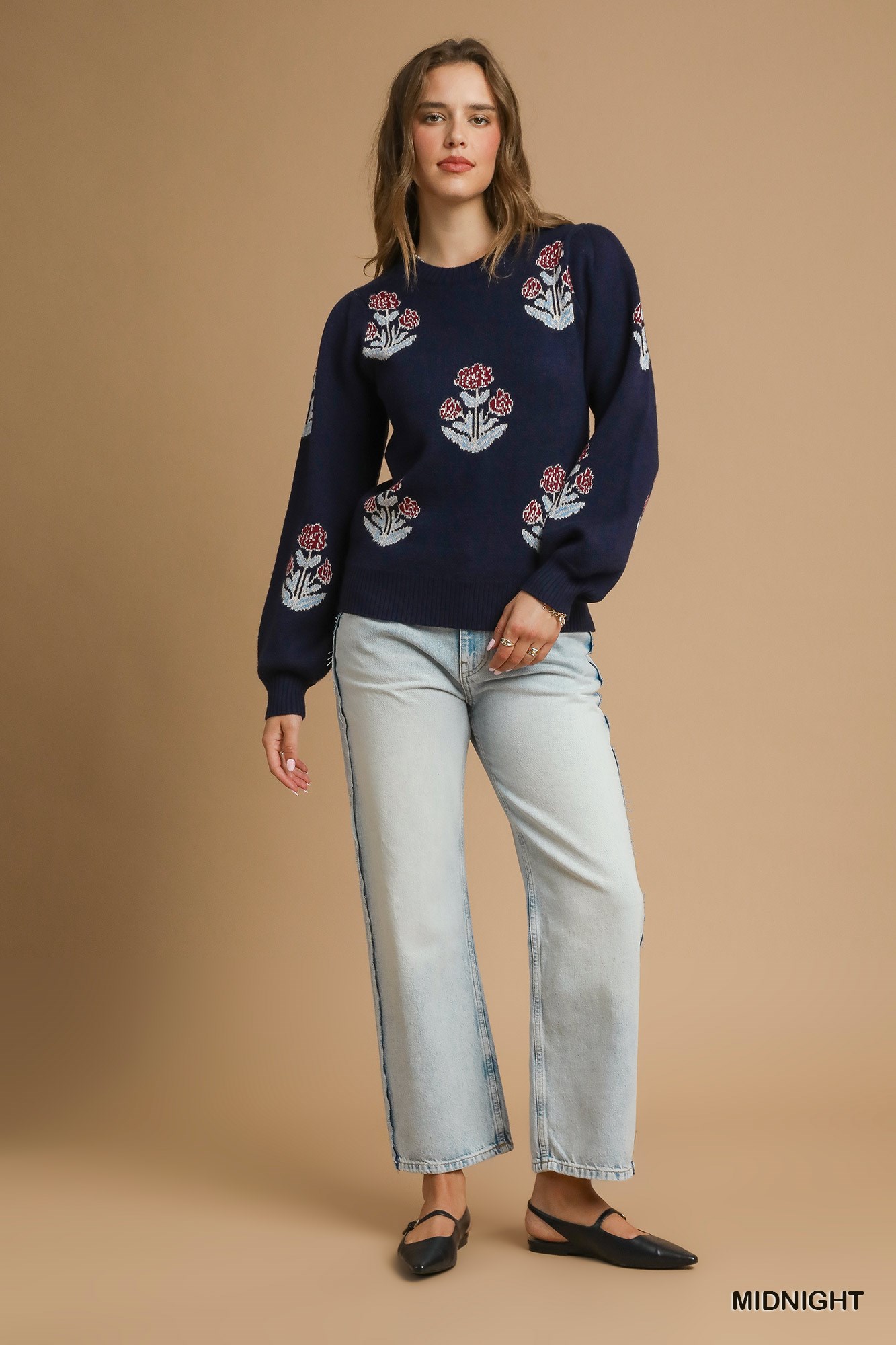 Umgee Floral Knit Sweater with Puff Sleeves