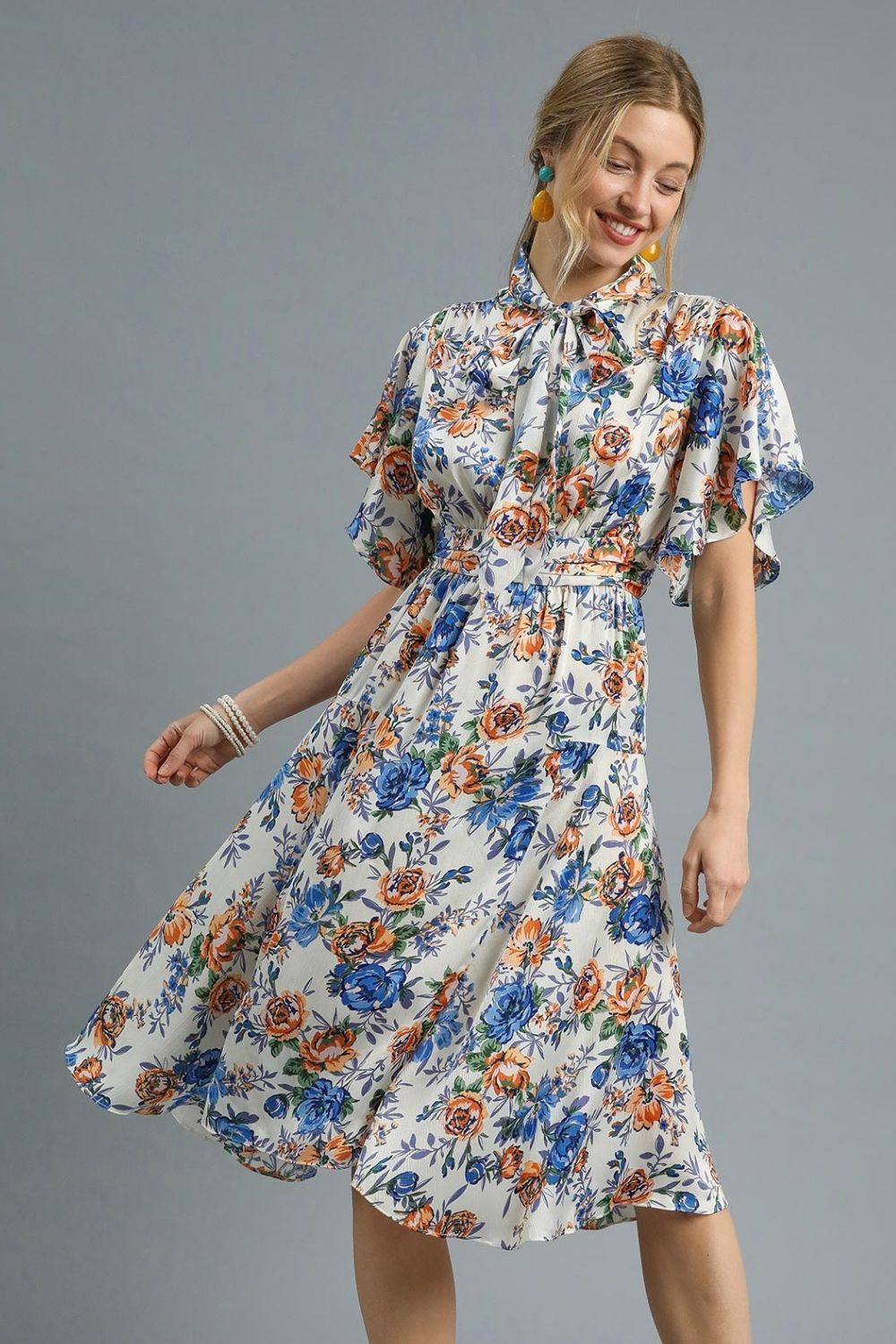 This elegant floral midi dress features a charming vintage-inspired print with blue and orange blooms on a light background. Crafted from lightweight chiffon material that drapes beautifully, it showcases a sophisticated mock neck collar and delicate ruffle sleeves that add feminine charm. The belted waist creates a flattering silhouette while the flowing A-line cut provides comfortable movement. Perfect for casual outings, garden parties, or romantic dates, this versatile piece combines retro elegance with modern comfort. The button-up front and elastic waistband ensure easy wear and comfortable fit.