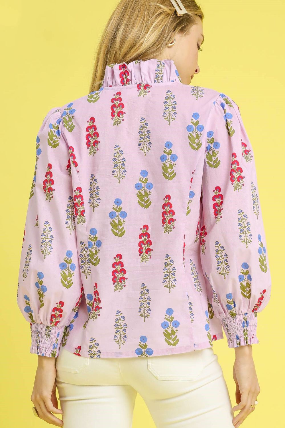 This charming pink blouse features a delightful all-over floral print pattern with vibrant multicolor blooms. The romantic puff sleeves with elastic smocked cuffs create a feminine silhouette, while the button-front closure and classic collar add timeless appeal. Made from lightweight, breathable fabric perfect for spring and summer wear. The relaxed fit ensures comfort while maintaining a polished look, making it ideal for both casual outings and office wear. Pairs beautifully with jeans, skirts, or tailored pants for versatile styling options.