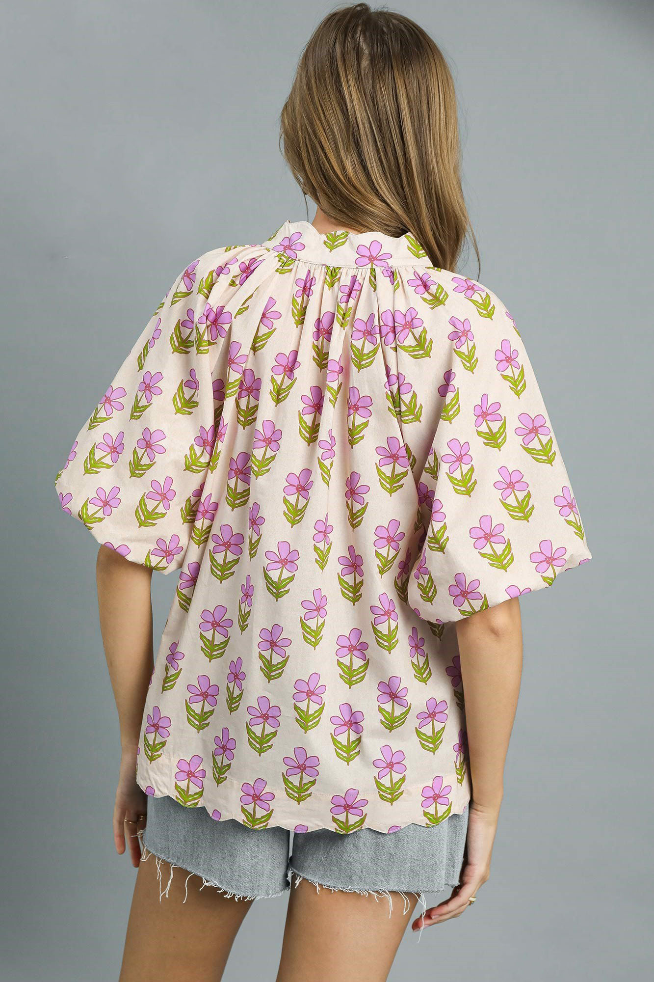 This charming oversized blouse features a delicate floral print in soft pink and green tones on a light background. Crafted from lightweight, breathable fabric perfect for warm weather, it offers a relaxed, comfortable fit. The V-neckline with decorative tie detail adds feminine appeal, while the short flutter sleeves provide easy movement and a breezy feel. The hip-length cut pairs beautifully with jeans, shorts, or skirts for versatile styling options. Ideal for casual outings, weekend brunches, or vacation wear.