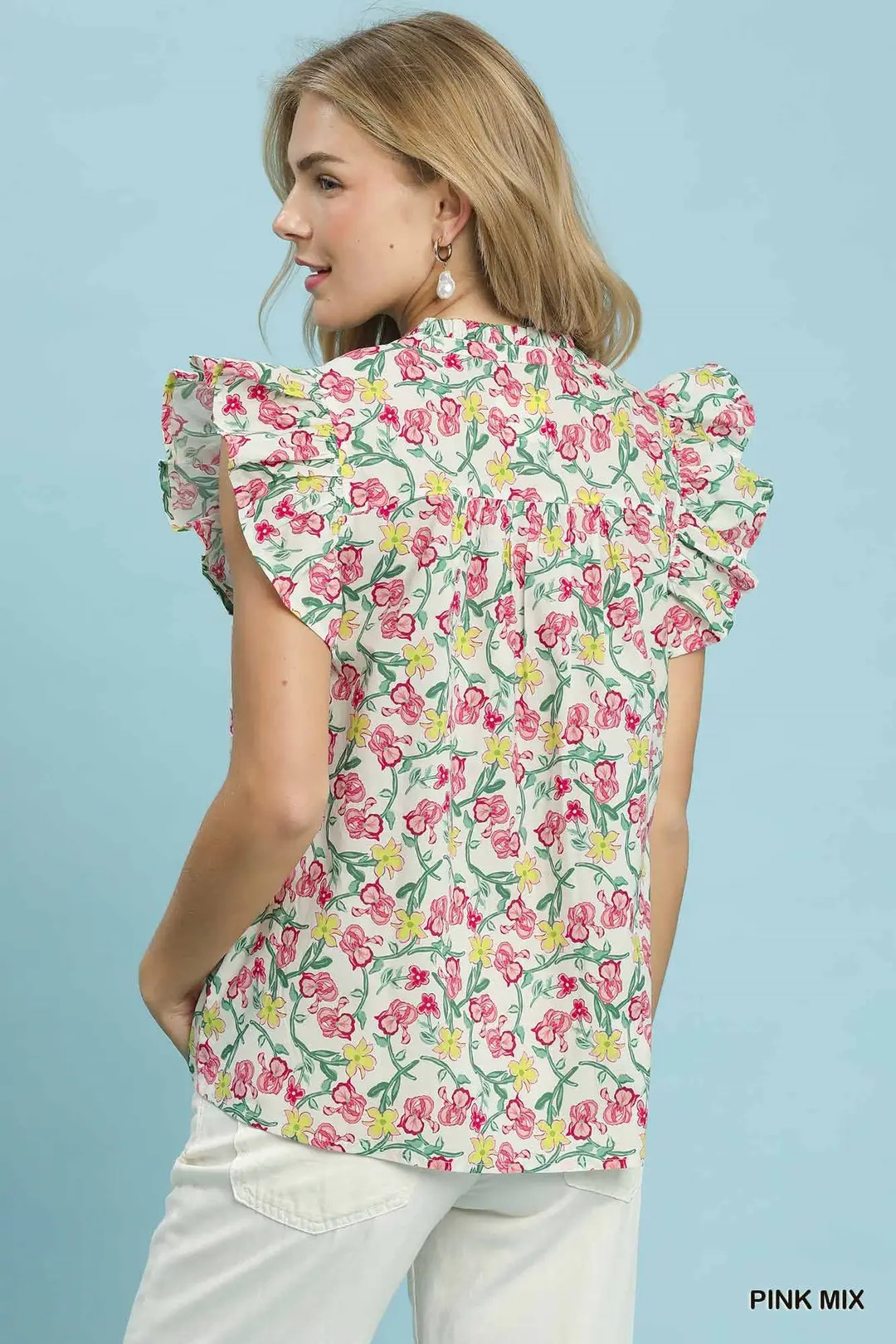 Infused with dreamy garden-inspired charm, this floral print ruffle top boasts a relaxed babydoll silhouette for a soft, laid-back fit. It is finished with a flattering V-neckline and functional button placket, complemented by dramatic tiered ruffle cap sleeves that amplify romantic feminine flair. Designed with an empire waist and gathered body detailing, it creates a gentle, flowy drape and effortless shape. Lightweight and unlined for breathability, this airy piece offers all-day comfort and easy movement. A versatile warm-weather essential, it pairs seamlessly with denim, shorts and casual bottoms for brunch, daytime outings, vacation and everyday boho styling.