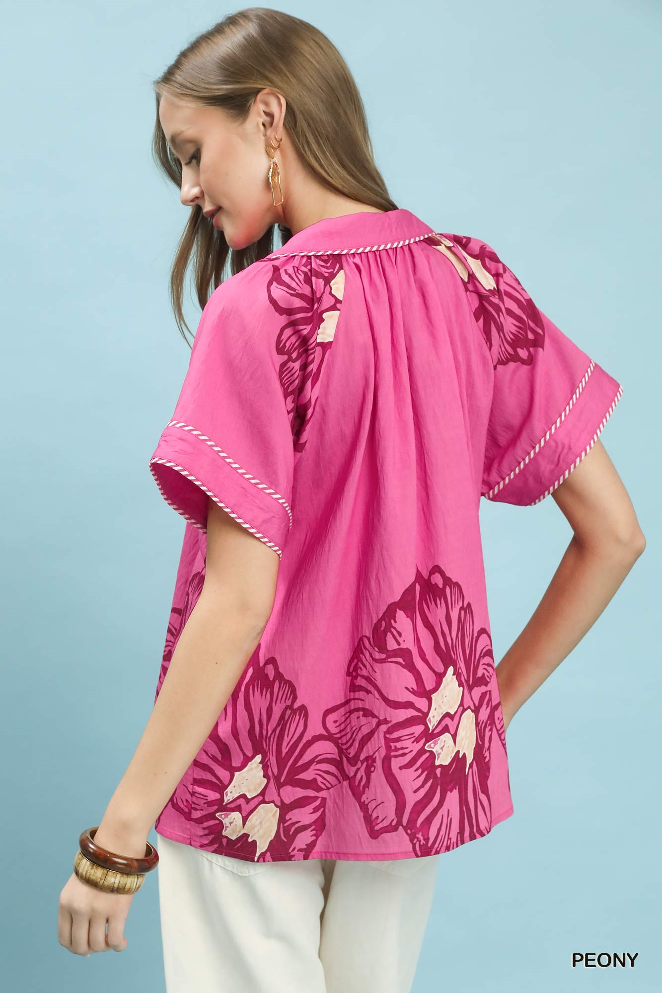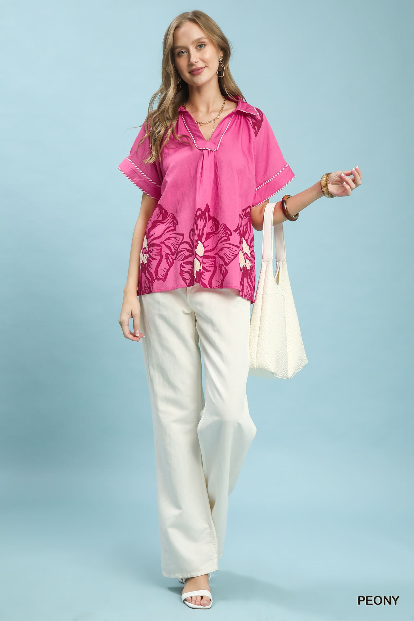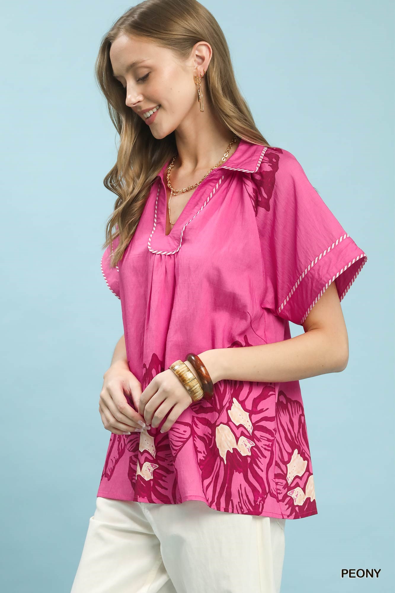 This Floral Split-Neck Short Sleeve Top features a split V-neck design, short dolman sleeves, delicate trim detail, and contrast piping for a refined touch. It is unlined, lightweight and breathable, making it a stylish and comfortable choice for daily casual wear.