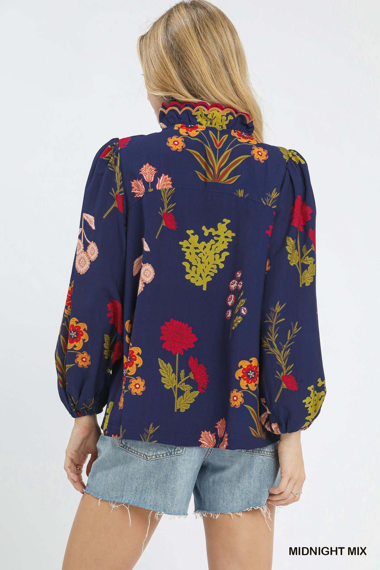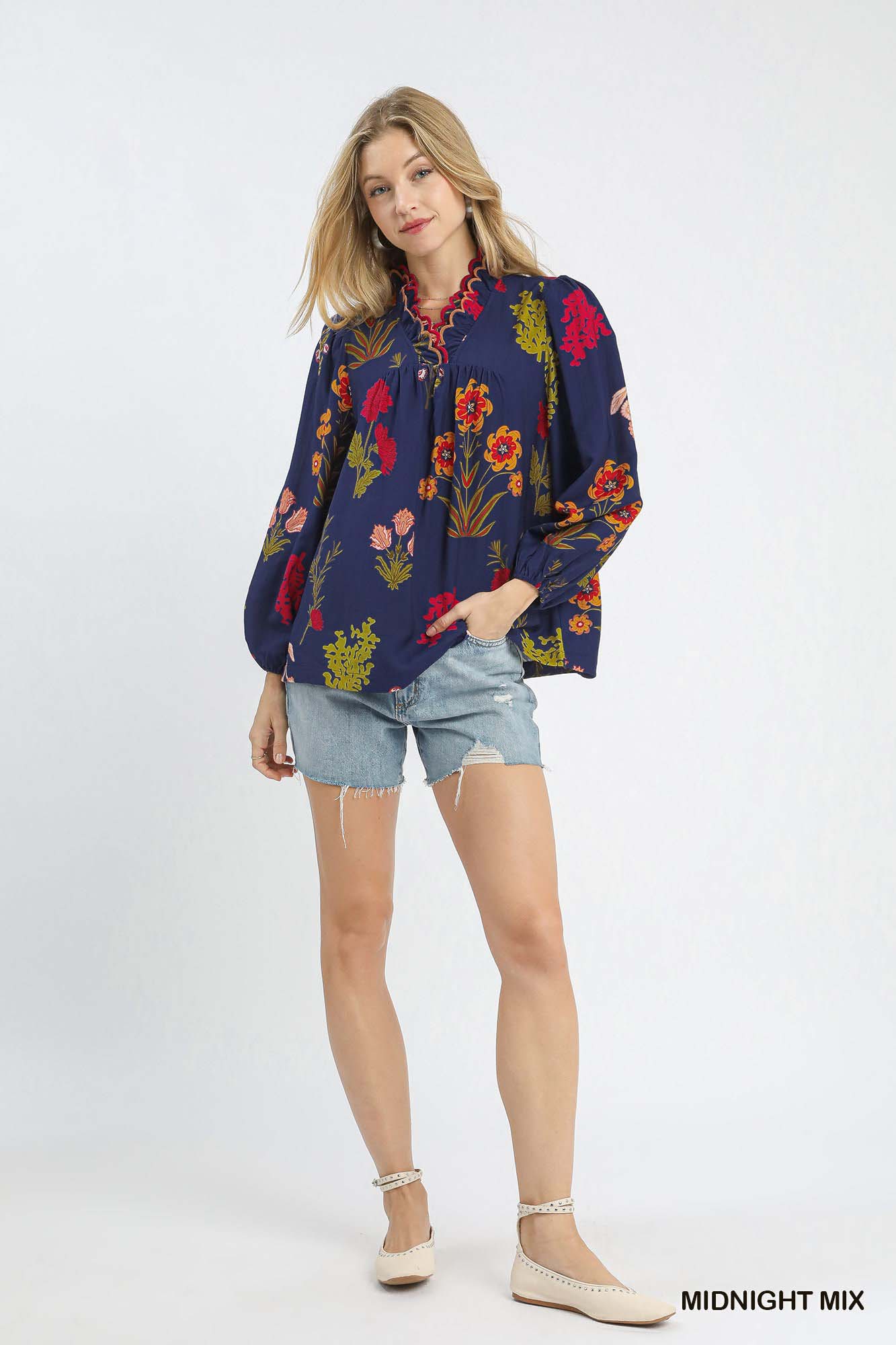 This flower print blouse top features a scalloped neckline with contrast trim, adding a touch of sophistication to the piece. The long sleeves come with elastic cuffs for a comfortable fit. The vibrant flower print adds a pop of color and personality to the overall look. Please note that this blouse top is not lined, providing a lightweight feel for all-day wear. Perfect for adding a feminine touch to your everyday wardrobe.