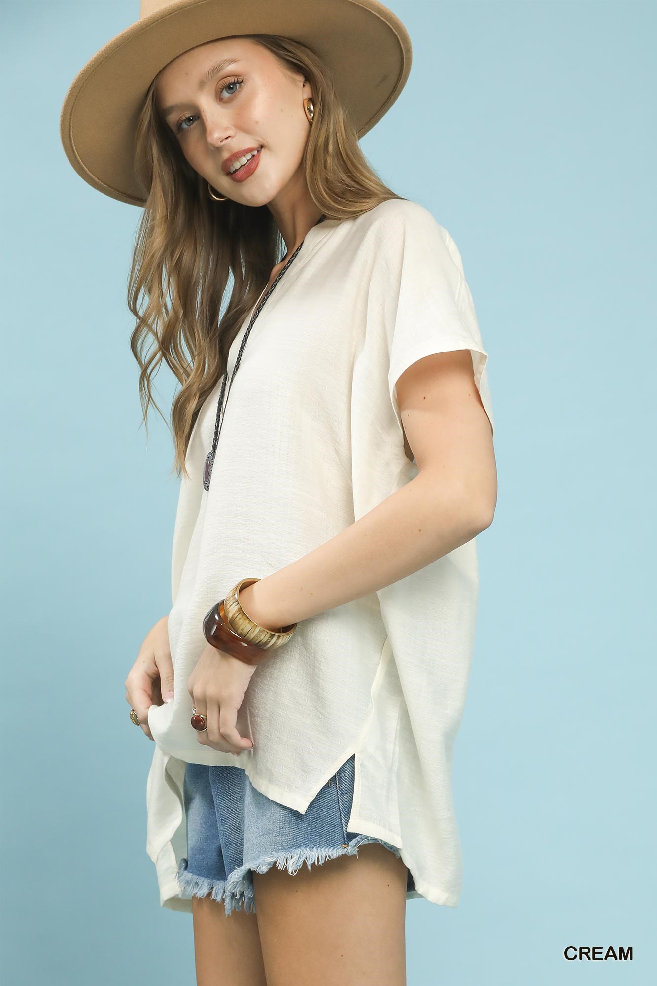 The flowy V-neck short sleeve blouse is a versatile and effortless piece for any wardrobe. With its relaxed fit and flowy silhouette, this blouse offers a comfortable and flattering look. The V-neckline adds a touch of elegance and elongates the neck for a slimming effect. Perfect for both casual and dressier occasions, this blouse can be dressed up with a skirt or trousers or styled casually with jeans. The short sleeves provide a breezy and comfortable feel, making it ideal for warmer days. Elevate your everyday style with the chic simplicity of this flowy V-neck short sleeve blouse.