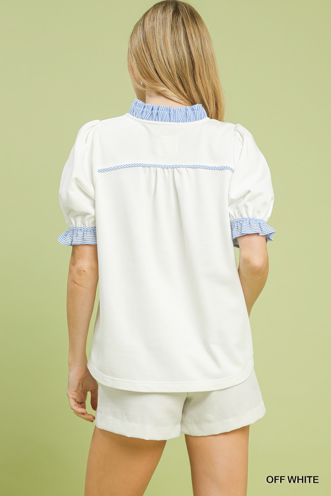 The French Terry Ruffle Trim Puff Sleeve Top is a blend of comfort and style. Crafted from soft French terry fabric, this top is cozy and luxurious to wear. The ruffle trim adds a touch of elegance and femininity to the design. Puff sleeves enhance the overall chic and trendy look of the top. Perfect for adding a fashion-forward element to your casual or dressed-up outfits.