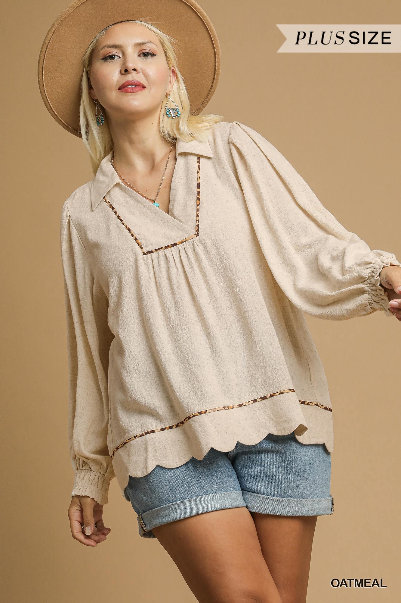 The Linen Scallop Hem Blouse with Contrast Trim is a stylish and chic addition to any wardrobe. The contrast trim adds a pop of color and detail to the classic design. Made from high-quality linen, this blouse is both comfortable and breathable. The scallop hem adds a feminine touch to the overall look. Perfect for pairing with jeans or dress pants for a versatile and fashionable outfit.