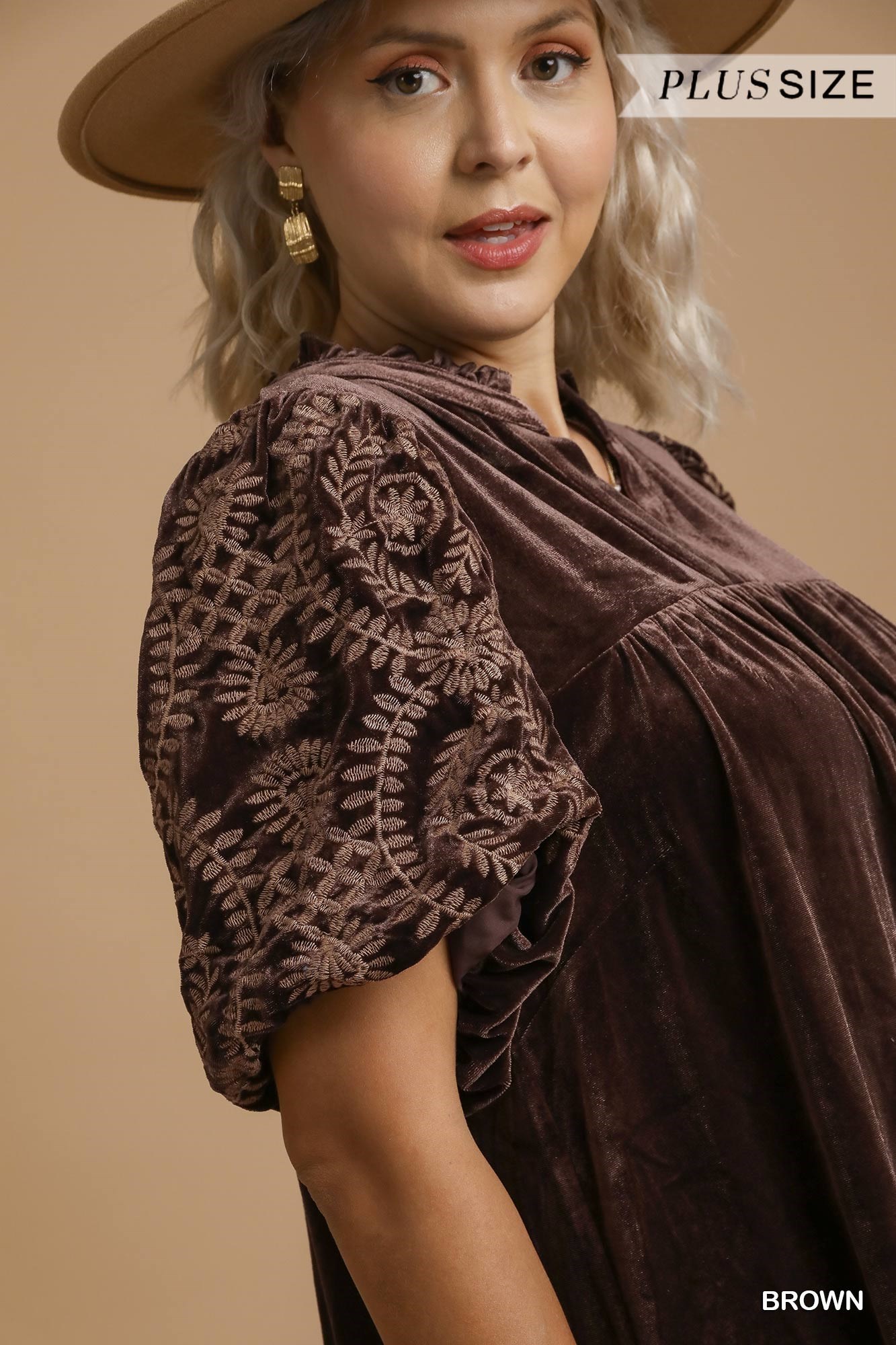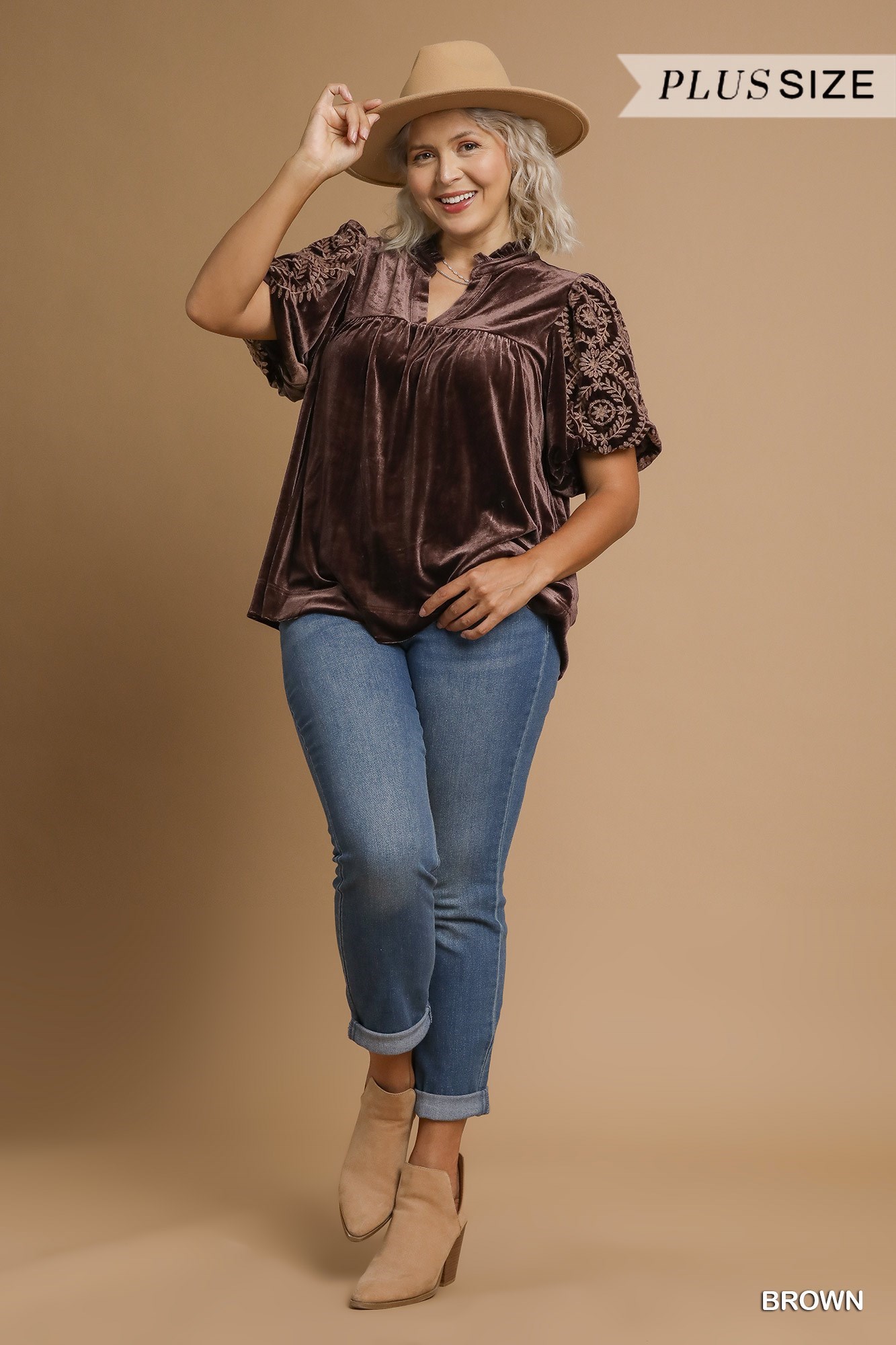 This elegant bohemian velvet blouse showcases intricate embroidered detailing on the short sleeves, adding a touch of artistry and charm. Crafted from premium velvet material in a rich brown tone, it offers a luxurious feel and a comfortable, relaxed fit. The combination of smooth velvet body and delicate embroidered sleeves creates a perfect balance of comfort and style. Ideal for casual outings or semi-formal occasions, this versatile piece can be easily paired with jeans or dress pants for an effortless chic look.