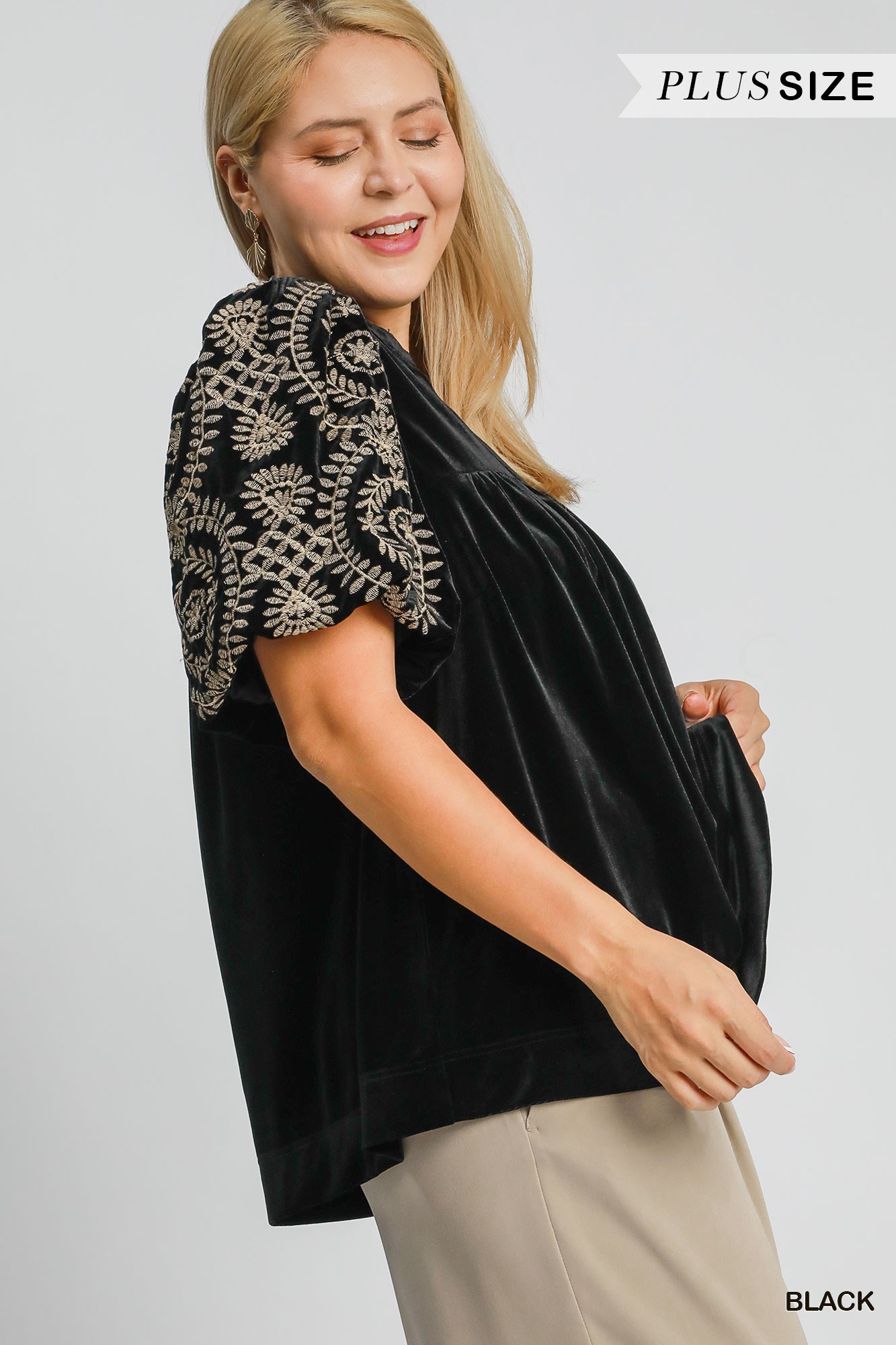 This velvet embroidered sleeve blouse combines luxe velvet fabric with intricate embroidery for a sophisticated and stylish look. The embroidered sleeves add a touch of elegance and detail to the classic blouse silhouette. Perfect for adding a touch of glamour to your outfit, this blouse is versatile for both casual and dressy occasions. Elevate your wardrobe with this chic and unique piece that effortlessly transitions from day to night with timeless charm.