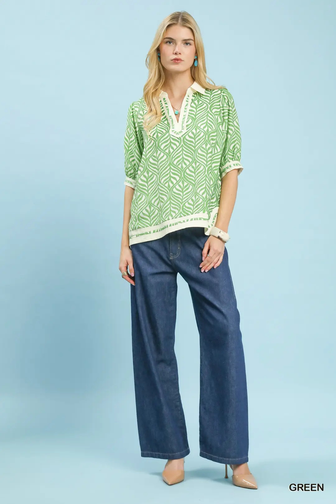 The Geometric Leaf Print Popover Top features a stylish geometric leaf motif that adds a playful and trendy touch to your outfit. It includes a V-notch with contrast banding for a unique and eye-catching neckline design. The short sleeves with gathered cuffs give a feminine and relaxed look, perfect for casual wear. Piping details add a subtle yet elegant finish to the overall aesthetic of the top. Please note that this top is not lined, making it lightweight and breathable for comfortable all-day wear.