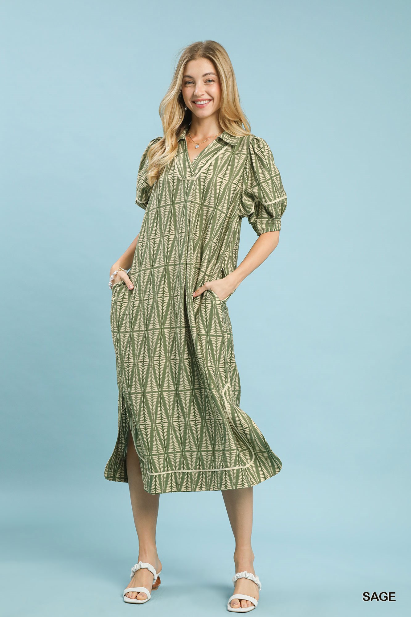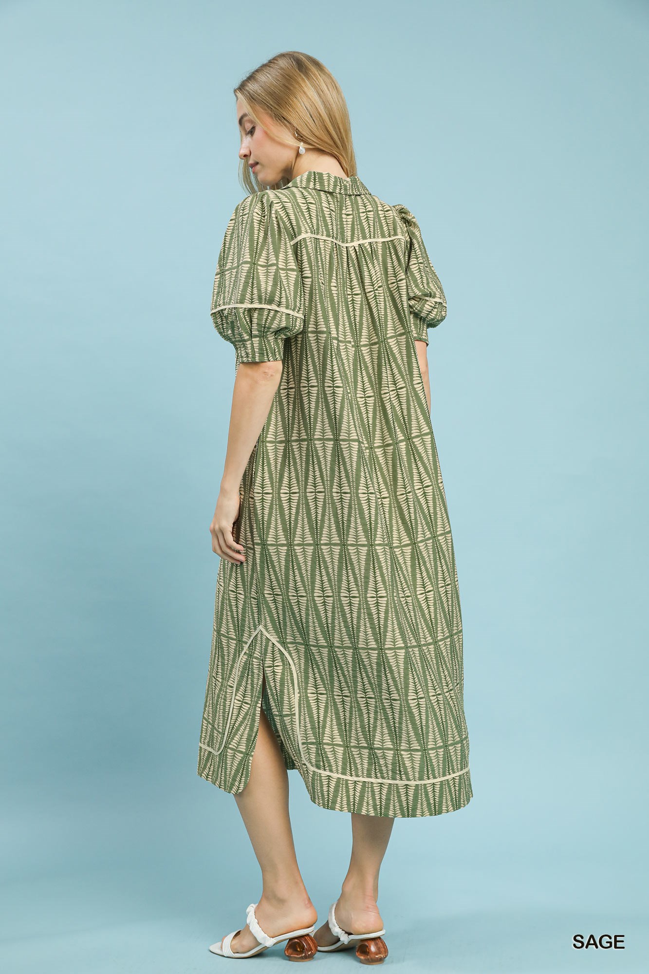 Introducing the Geometric Print Midi Dress, a chic and modern addition to your wardrobe. This dress features a unique geometric leaf-inspired print that adds a touch of artistic flair. The V-neckline and short puff sleeves create a stylish and flattering silhouette. With a side slit hem and relaxed midi-length design, this dress offers both comfort and sophistication. Perfect for both casual outings and special occasions, this dress is versatile and on-trend. Elevate your style with the Geometric Print Midi Dress and stand out with its contemporary appeal!