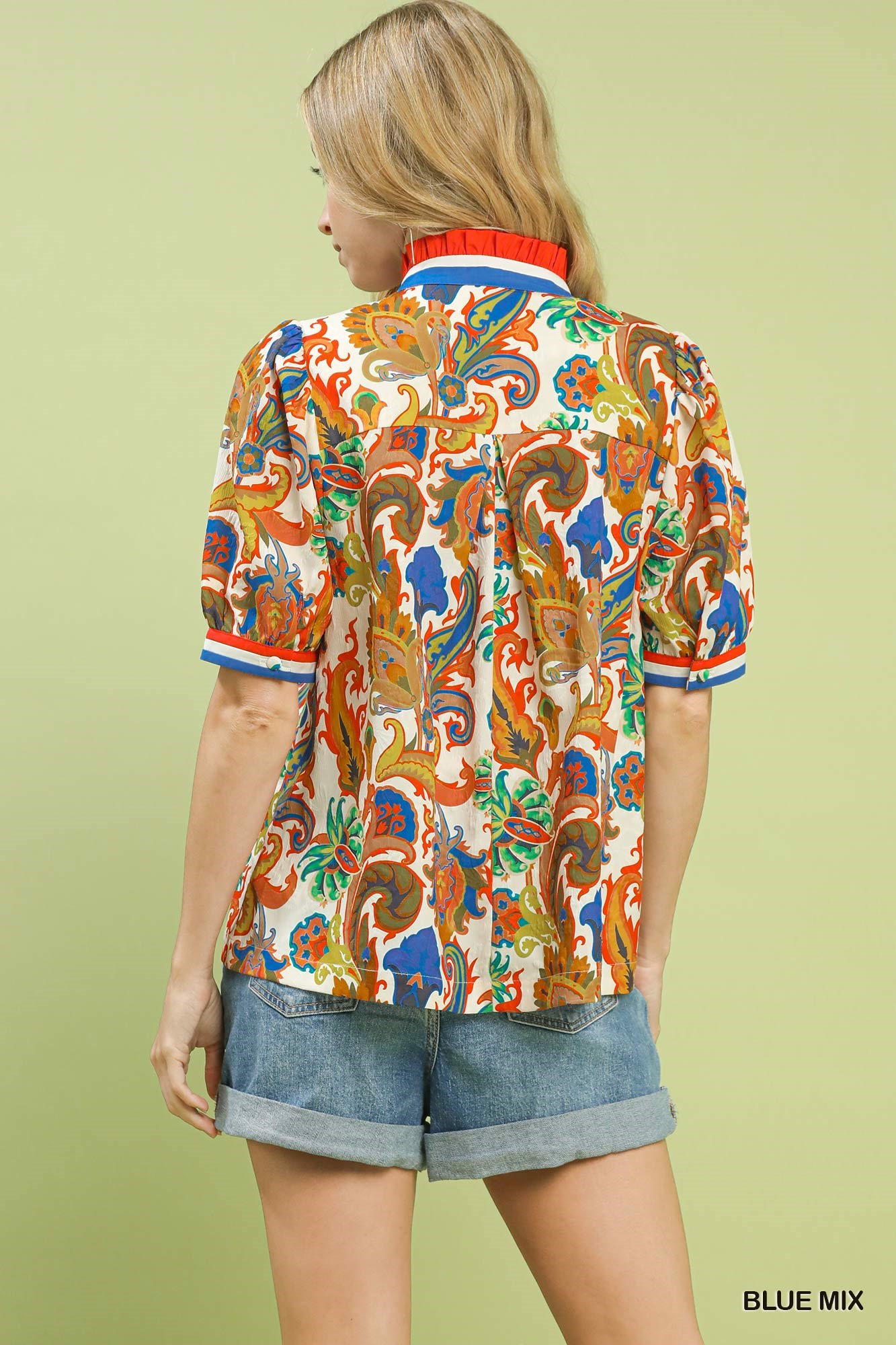 This Boho Paisley Print Blouse is a stylish and comfortable addition to any wardrobe. Featuring a vibrant paisley print, short sleeves, and a flattering V-neck with mandarin collar, this blouse offers a relaxed fit and lightweight fabric for all-day comfort. The eye-catching print and versatile design make it perfect for both casual and dressy occasions. Made from high-quality, breathable material, this blouse is easy to care for and will maintain its vibrant colors wash after wash. The unique blend of colors and patterns ensures you'll stand out in style. Perfect for spring and summer, this blouse is a must-have for those who appreciate bohemian fashion.
