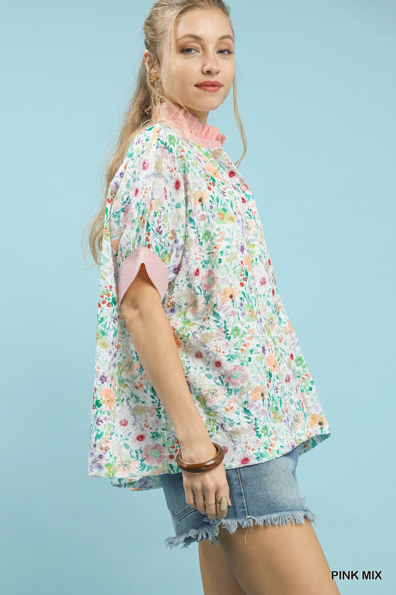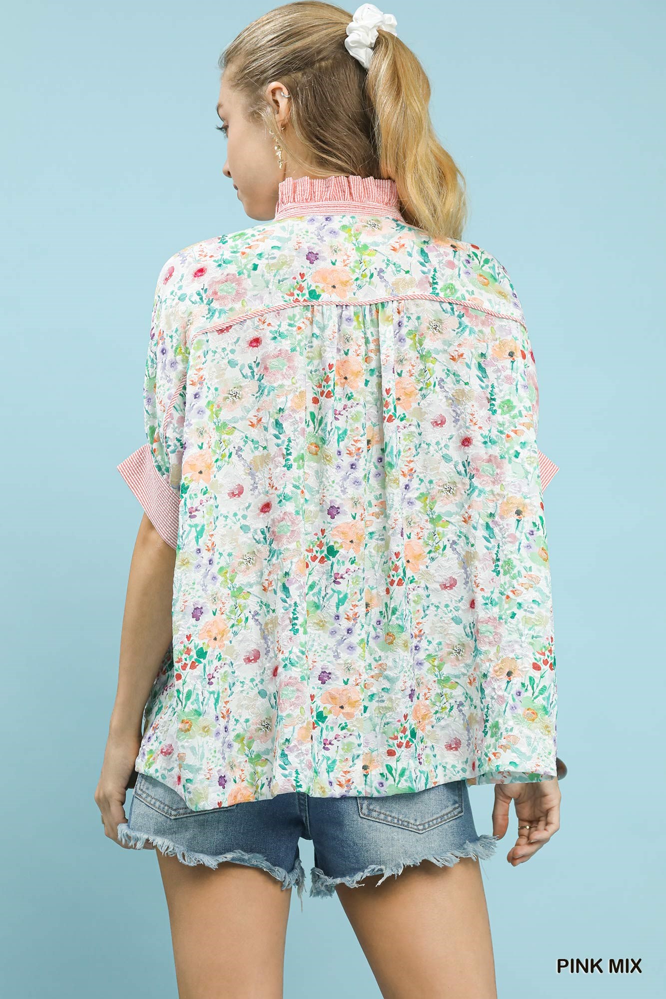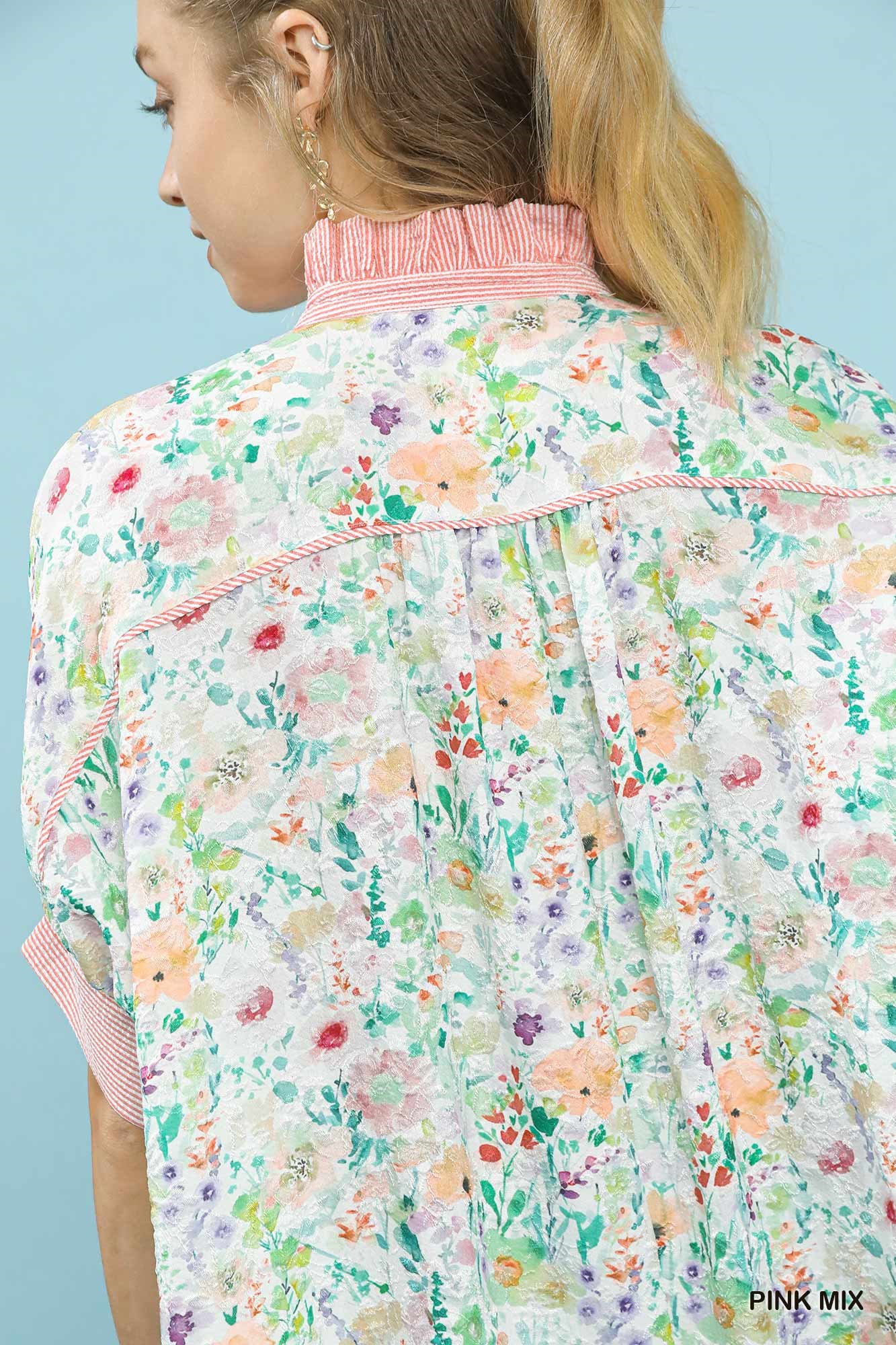 The Jacquard Floral Print Button-Down Top is a lovely and sophisticated piece that will elevate your wardrobe. Featuring a beautiful jacquard floral print, this top exudes elegance and charm. The button-down front with a striped contrast collar adds a unique and stylish touch to the design. Rolled short sleeves give a casual and relaxed vibe to this top. With a stripe contrast detail and a high-low hemline, this top offers a modern and fashionable look. Please note that it is not lined, making it comfortable and breathable for all-day wear.