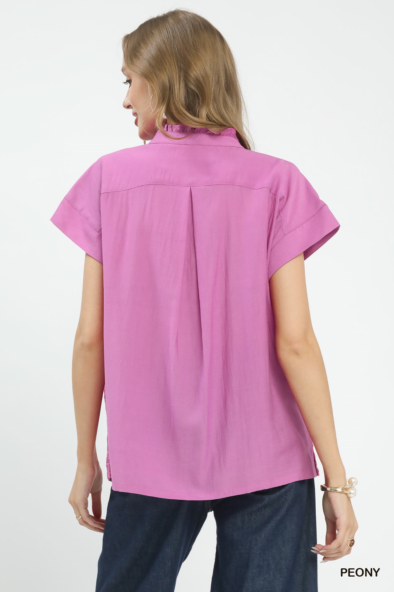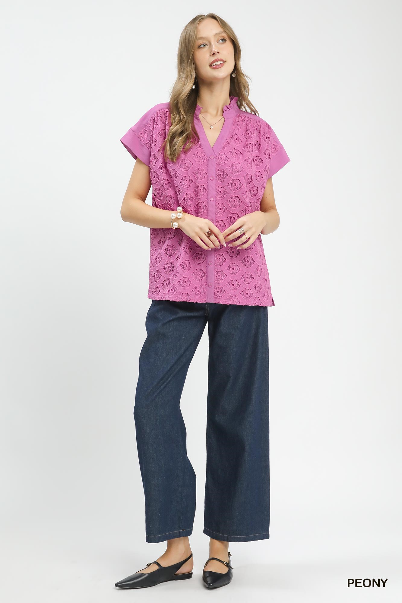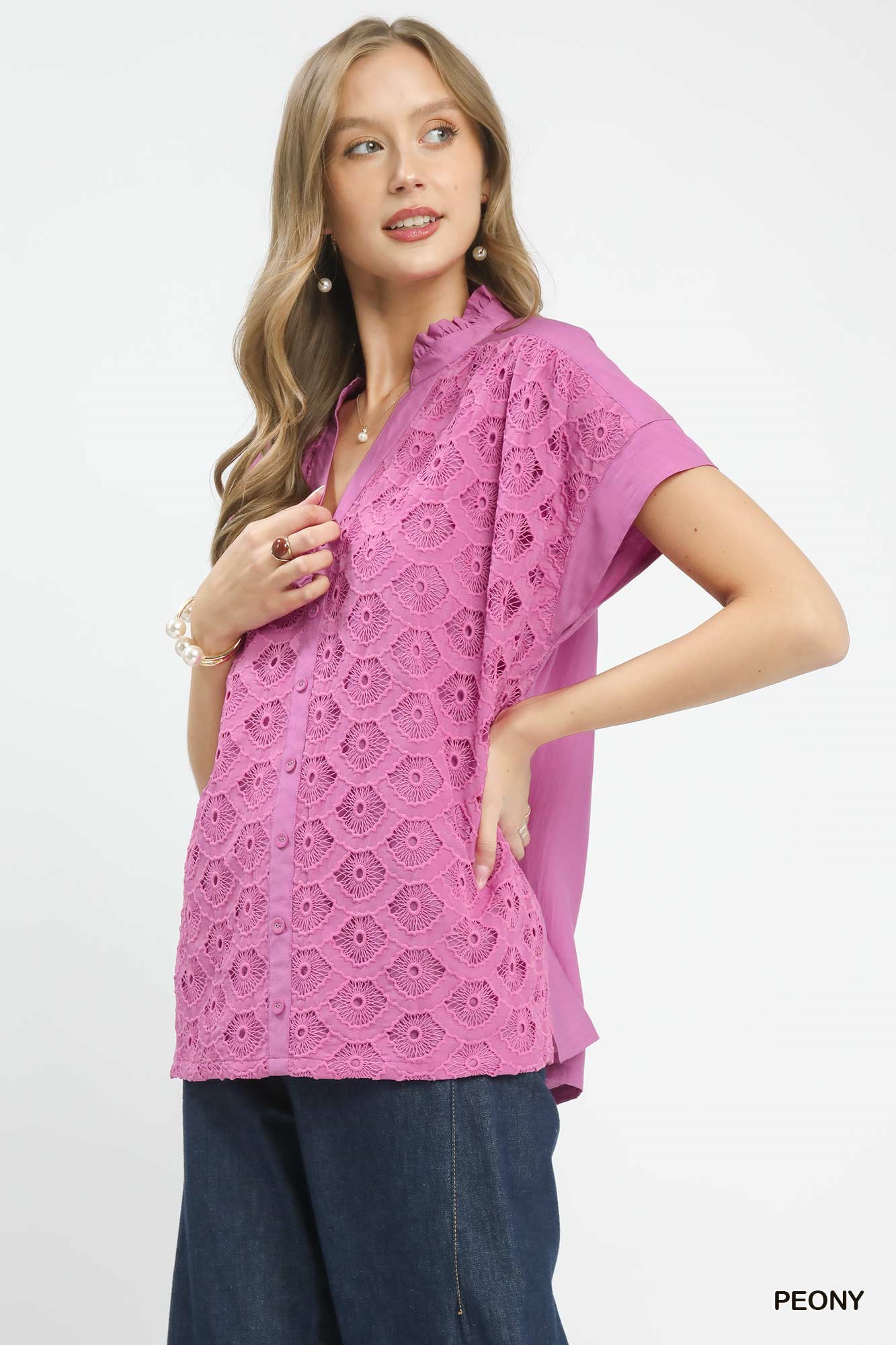 This Lace Button-Front Top is adorned with delicate, soft lace detailing for a romantic and feminine finish. It features a full button-front closure for easy wear and a timeless, versatile look. Crafted from lightweight, breathable fabric, it offers a relaxed fit and all-day comfort. Perfect for casual outings, dates, or layering, this top pairs effortlessly with jeans, skirts, and shorts to create elegant, sweet everyday styles.