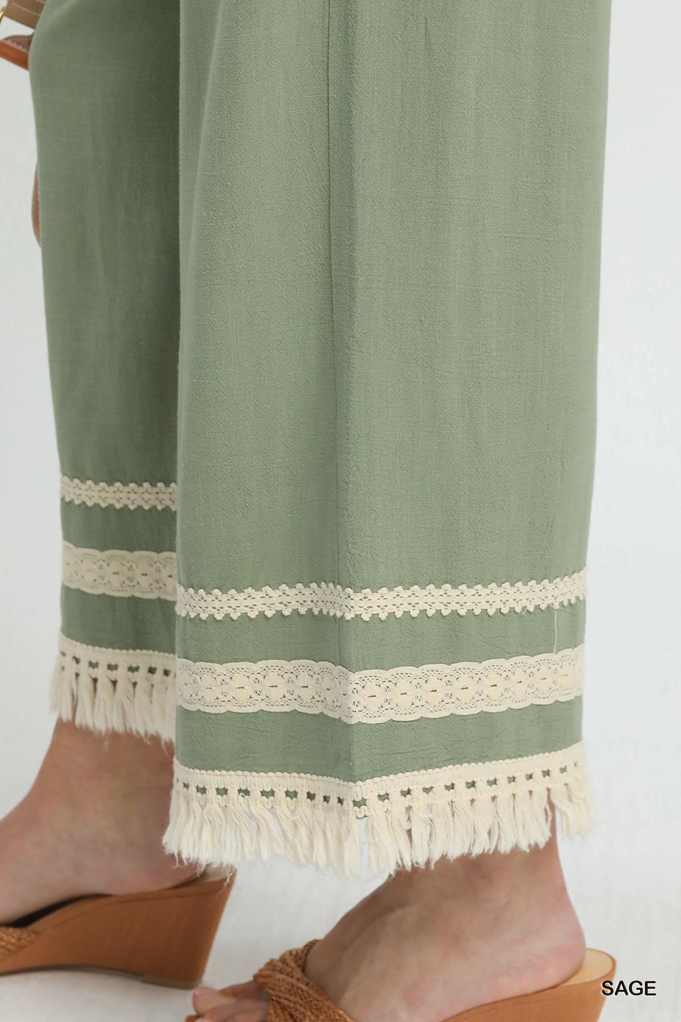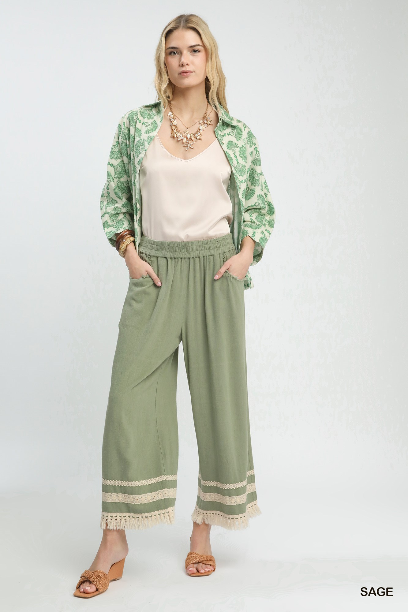 These wide-leg pants are made from a comfortable linen blend that is perfect for warm weather. The addition of lace trim adds a stylish and feminine touch to the design. With side pockets for convenience, these pants strike the perfect balance between fashion and functionality. While they are not lined, they are still a great choice for a chic and comfortable outfit. Embrace a bohemian vibe with these fringe hem wide-leg pants that are sure to elevate your casual wardrobe.