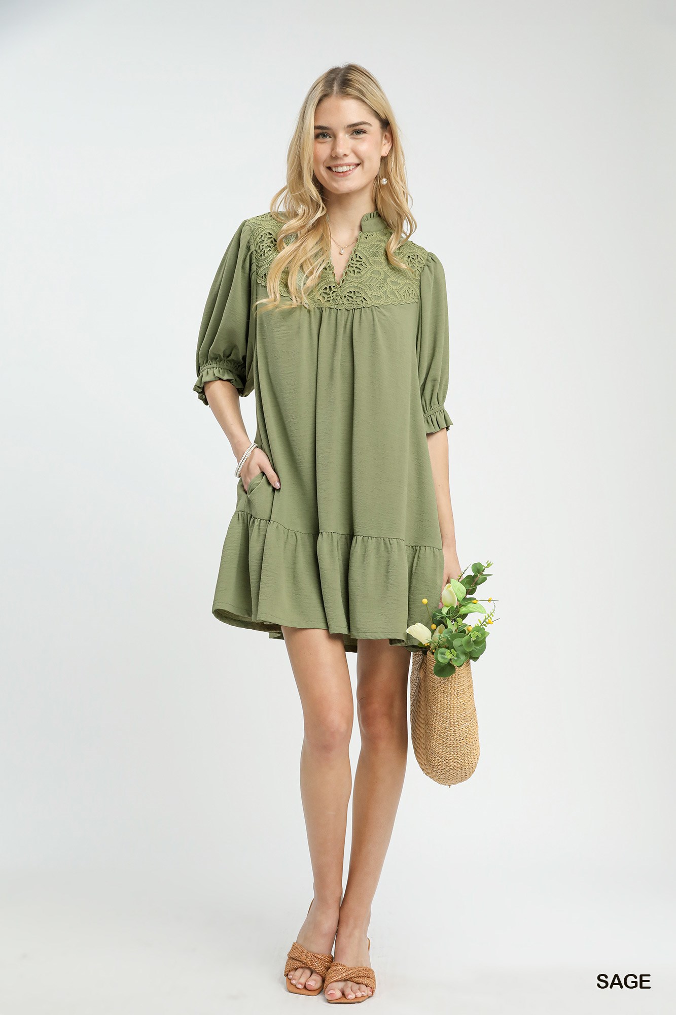 Make a statement in this Lace Yoke Tiered Mini Dress, featuring a split V-neck with a soft stand collar and delicate lace crochet detail for a romantic touch. The 3/4-length sleeves with elastic ruffle cuffs add a feminine flair to the design. With convenient side pockets and a tiered mini length, this dress effortlessly combines style and practicality. Perfect for a day out or special occasion, this dress is not lined for a light and airy feel. Embrace the charming details of this dress for a fresh and elegant look.