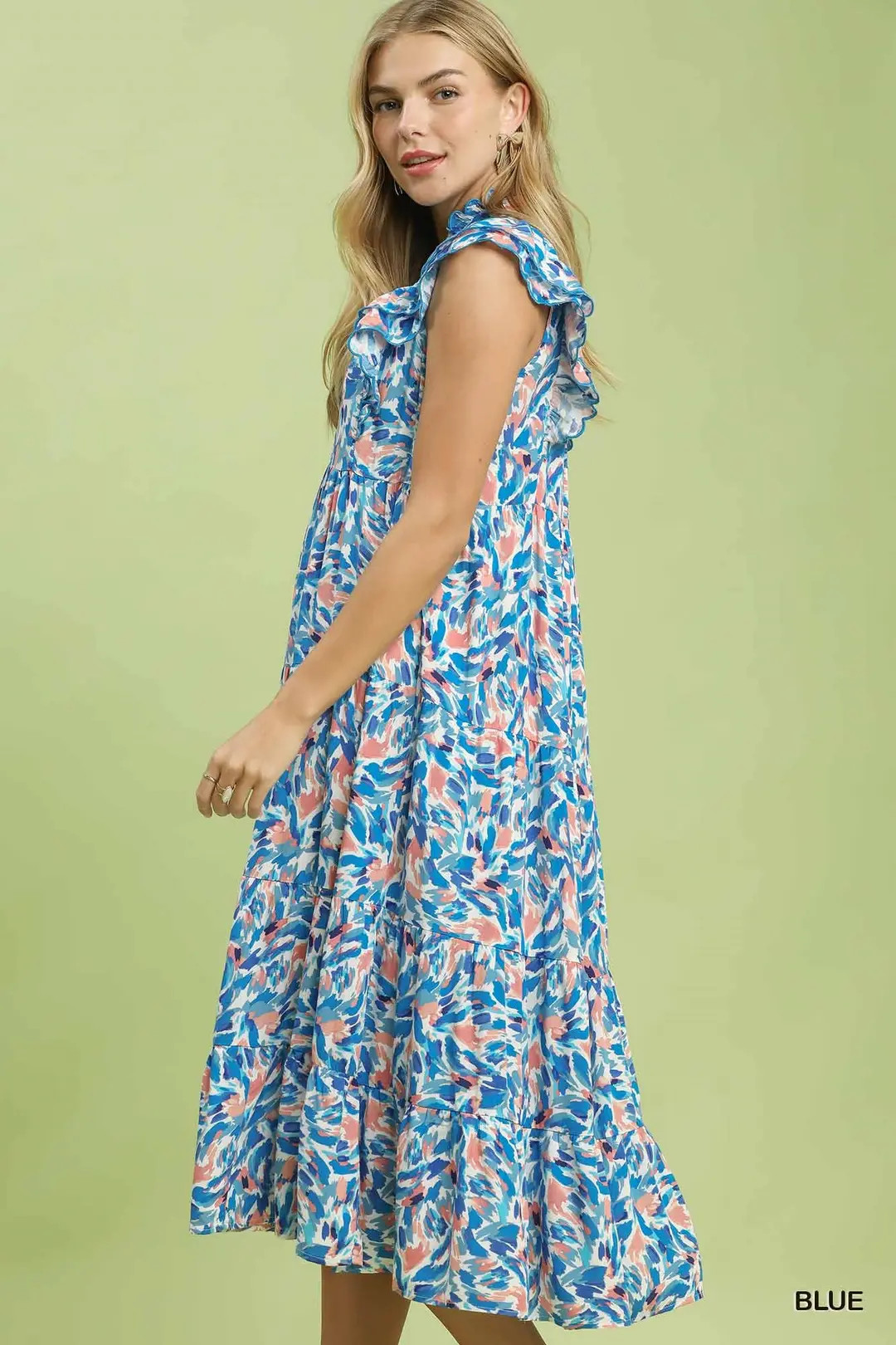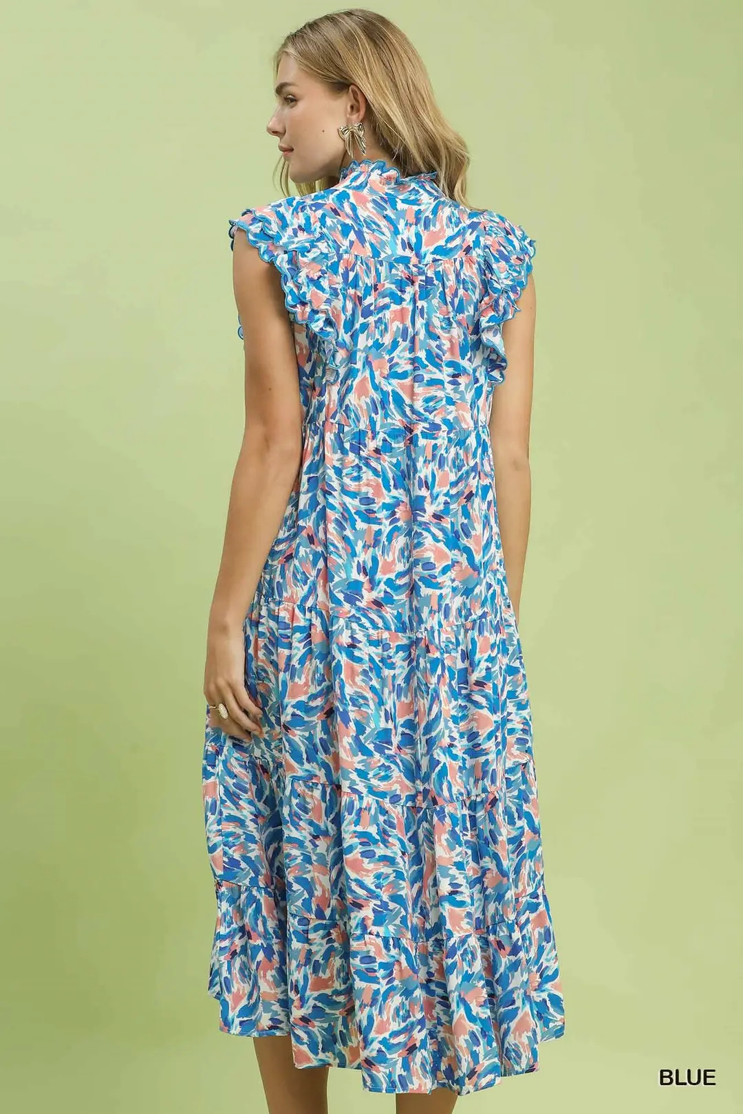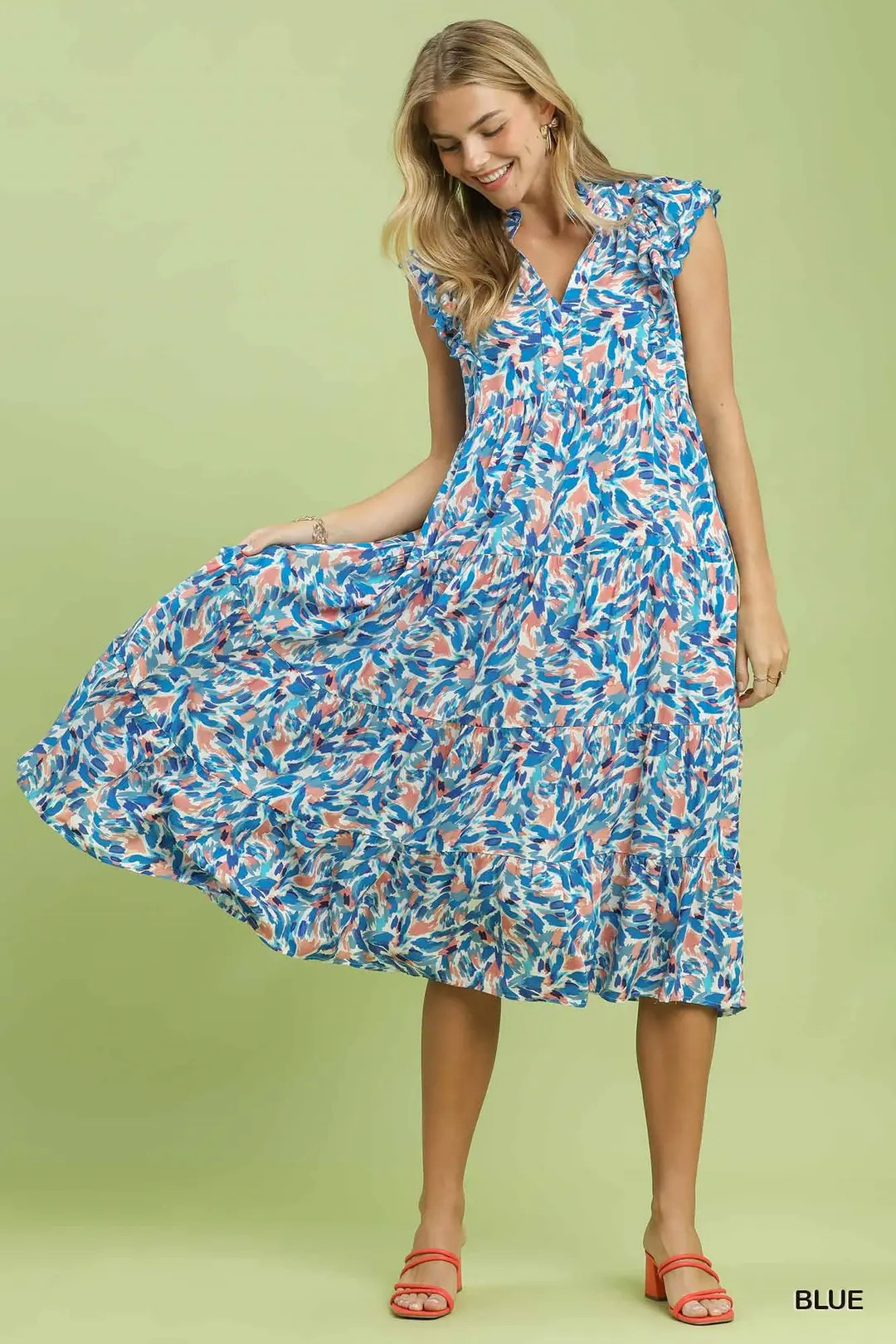 This leaf print midi dress features a fresh tropical-inspired pattern that brings a vibrant, vacation-ready feel to your wardrobe. It has a V‑neckline accented with a button placket, paired with delicate ruffle cap sleeves for a soft, feminine touch. The flowy multi‑tiered skirt creates lovely movement and falls elegantly to midi length, while convenient side pockets add practicality. Designed without lining for lightweight breathability, this sleeveless dress offers a breezy, relaxed silhouette perfect for beach days, resort wear, brunch, and warm‑weather outings.
