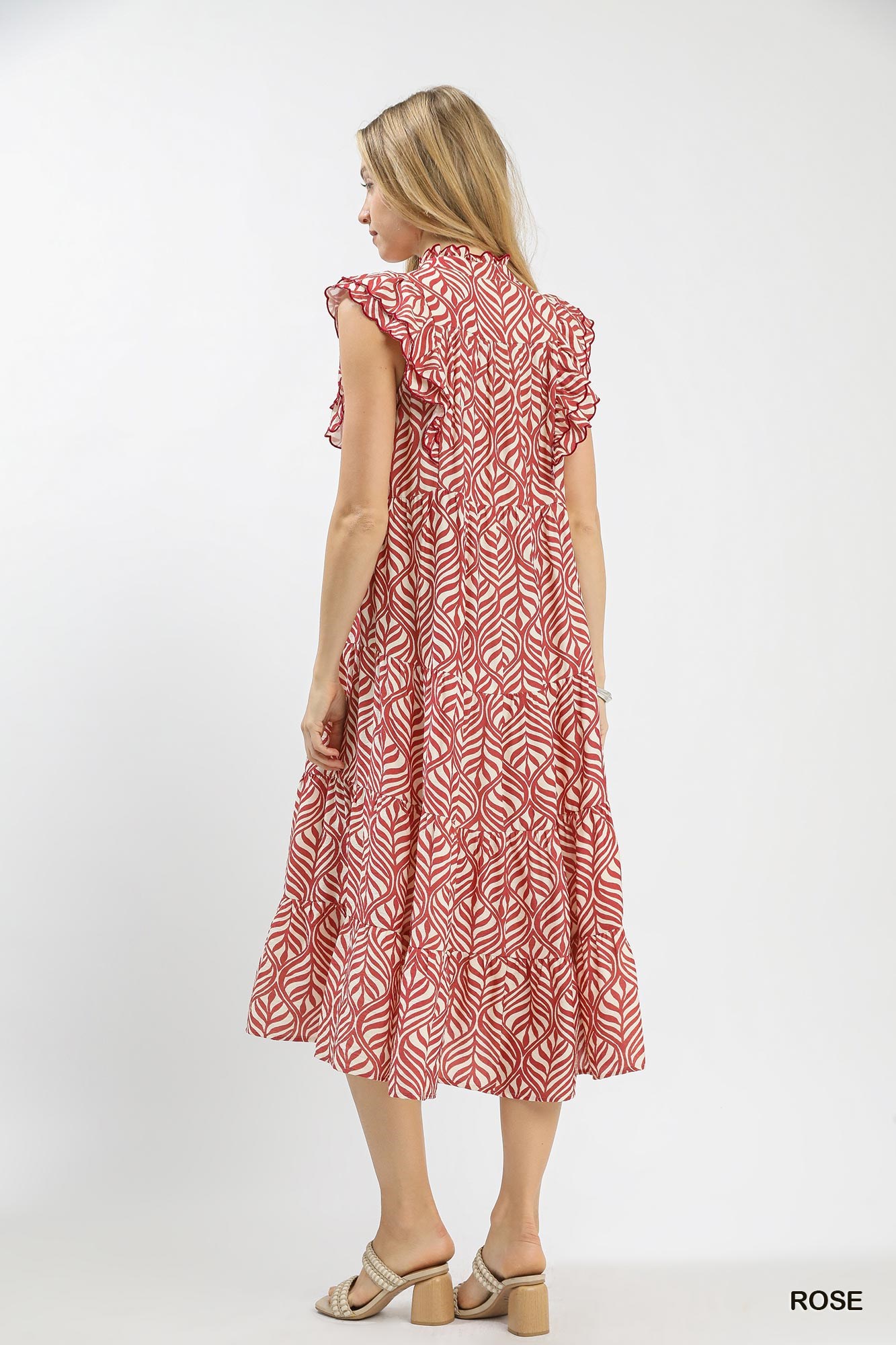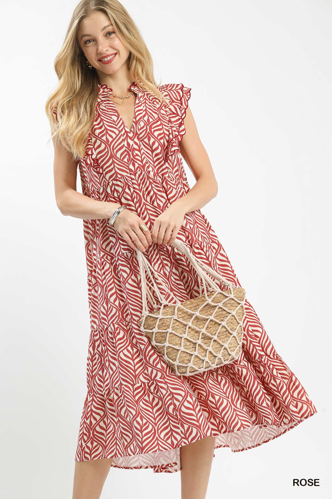 Umgee Leaf Print Tiered Midi Dress with Ruffle Detail