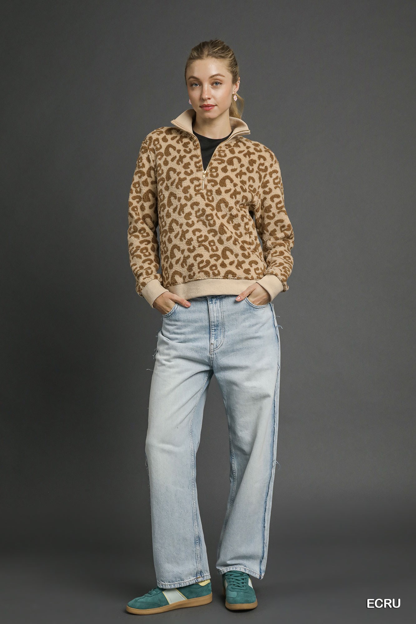 Umgee Leopard Print Quarter-Zip Sweatshirt