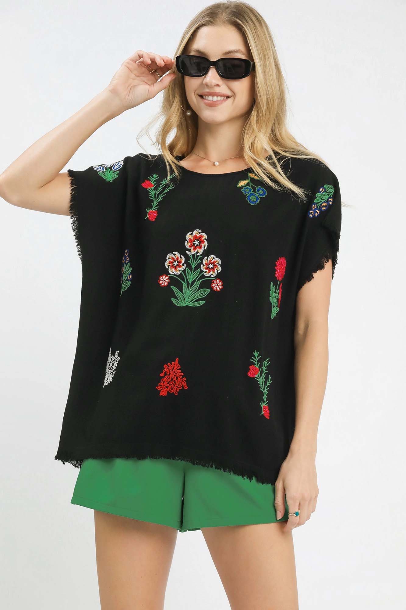 This Linen Blend Embroidered Frayed Hem Top features a round neckline and short sleeves with raw edge detail, giving it a casual and stylish look. The frayed hemline adds a trendy touch to the top's design. The allover floral embroidery adds a feminine and elegant touch to the overall aesthetic. Made from a linen blend, it offers breathability and comfort for wearing in warmer weather. Please note that this top is not lined for a more lightweight feel.