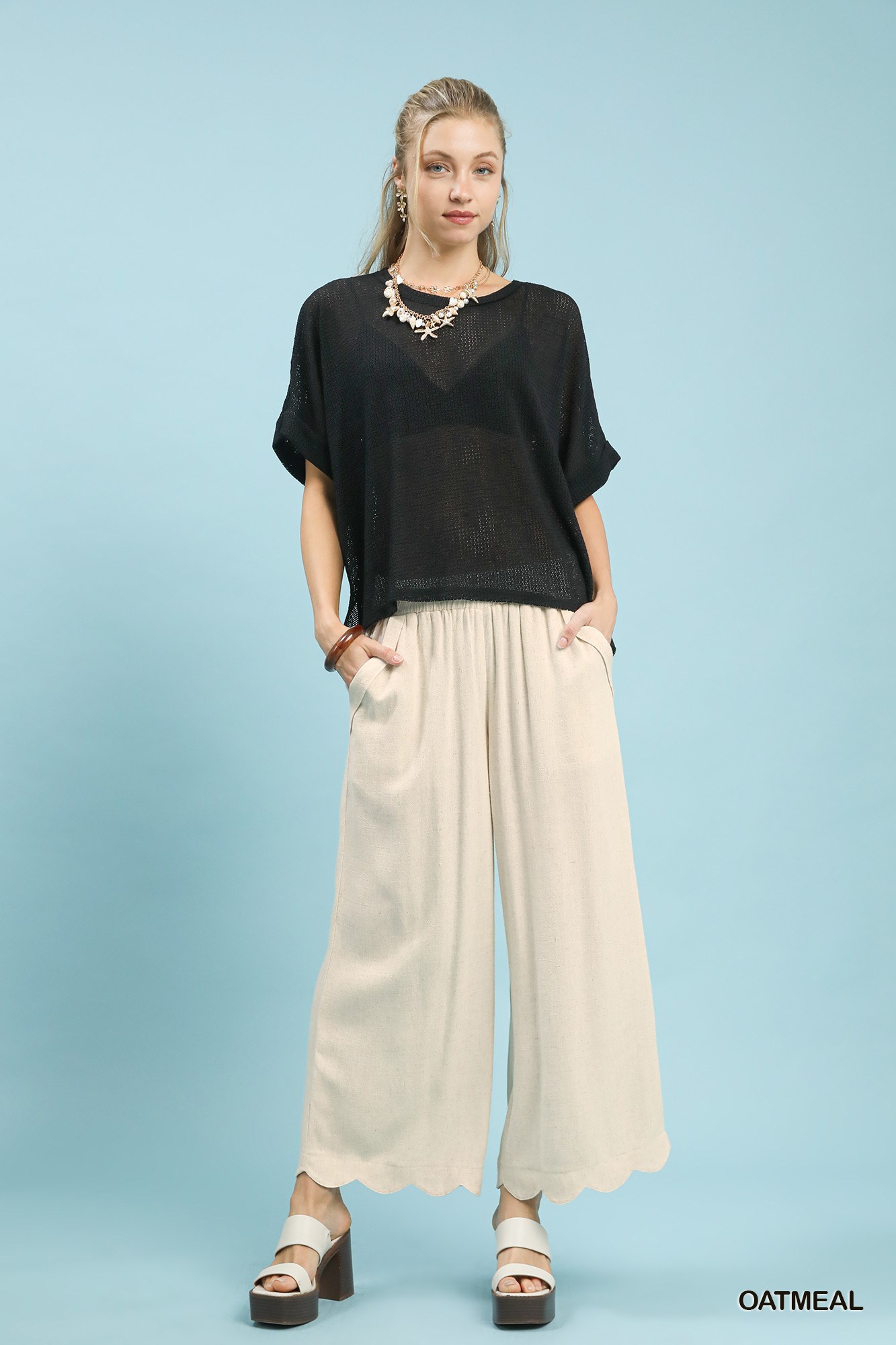 These linen blend wide leg pants feature a comfortable elastic waistband for a custom fit. The scalloped edge detail adds a unique and feminine touch to the design. With side pockets for practicality, these pants blend style and functionality seamlessly. Perfect for a casual yet chic look, the wide leg silhouette is both on-trend and flattering. Please note that these pants are not lined, allowing for breathability and ease of movement.