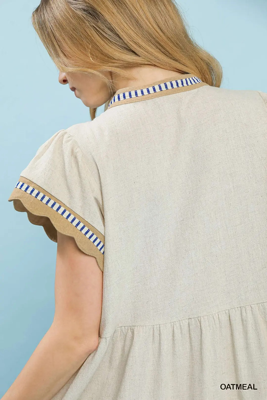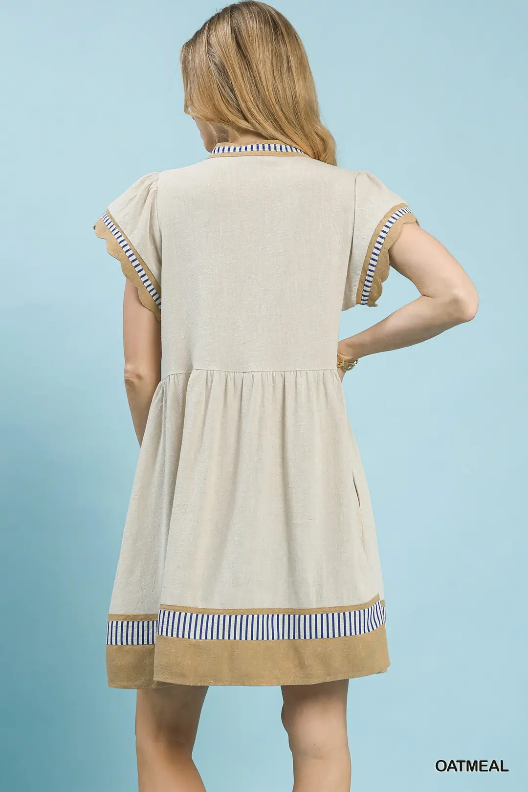 This dress features a fresh color-block design crafted from breathable linen fabric, offering a lightweight and airy feel perfect for warm weather. It has a flattering V‑neckline, flowy short flutter sleeves, and a tiered babydoll silhouette that creates gentle movement and a relaxed, feminine shape. Designed without lining for extra comfort, this dress blends casual ease with modern color-block styling, ideal for daily outings, vacations, and weekend gatherings.
