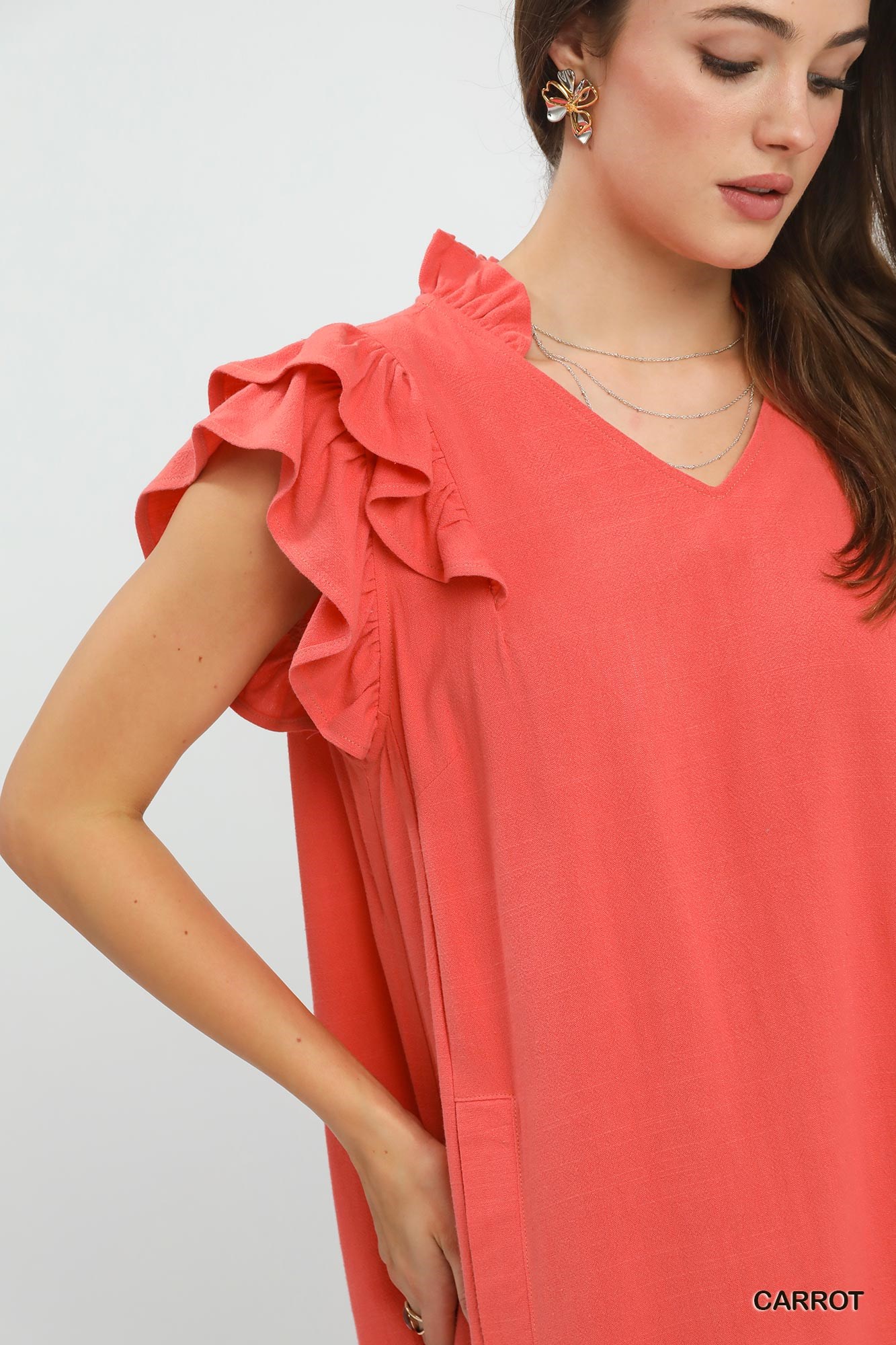 This linen flutter sleeve shift dress is the perfect blend of comfort and style, with its breathable fabric and V-neck design. The flutter sleeves add a charming and romantic touch to the dress, creating a feminine silhouette. Convenient side pockets offer practicality without compromising on the dress's sleek and simple look. Although not lined, the linen material provides a lightweight and airy feel, ideal for warm weather wear. Elevate your casual chic wardrobe with this versatile and easy-to-wear shift dress.