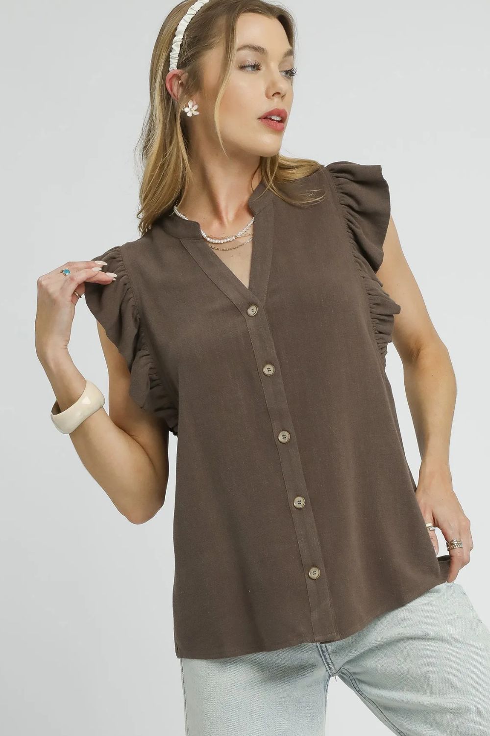 This stylish sleeveless blouse features distinctive ruffle sleeves that add feminine charm to any outfit. Made from comfortable fabric blend, it showcases a classic button-down front with elegant pearl-like buttons. The V-neck collar creates a flattering neckline while the relaxed fit ensures all-day comfort. Perfect for both office wear and casual outings, this versatile piece in sophisticated brown tone pairs beautifully with jeans, trousers, or skirts. The quality construction and timeless design make it a wardrobe essential for the modern woman seeking effortless style.