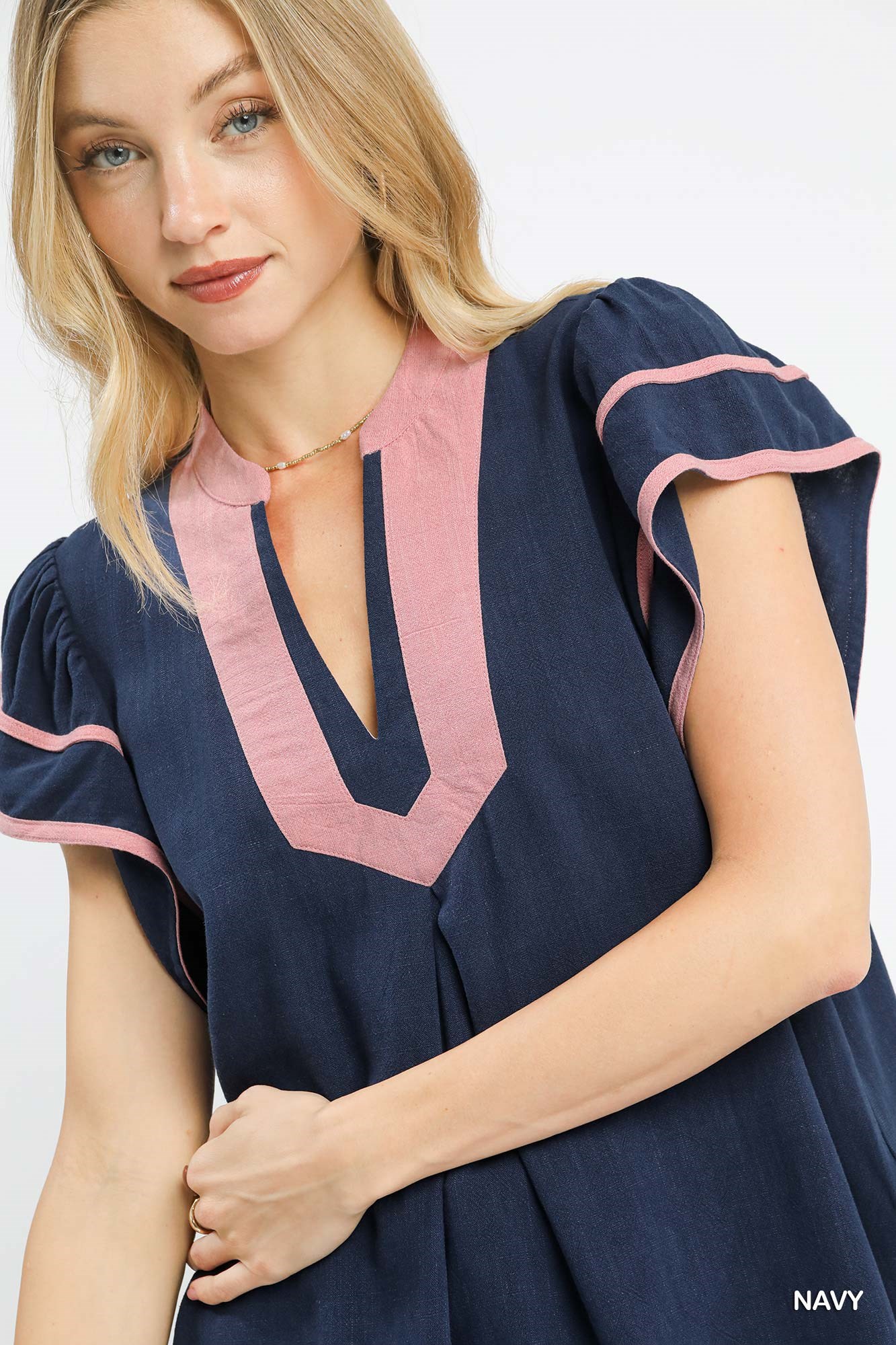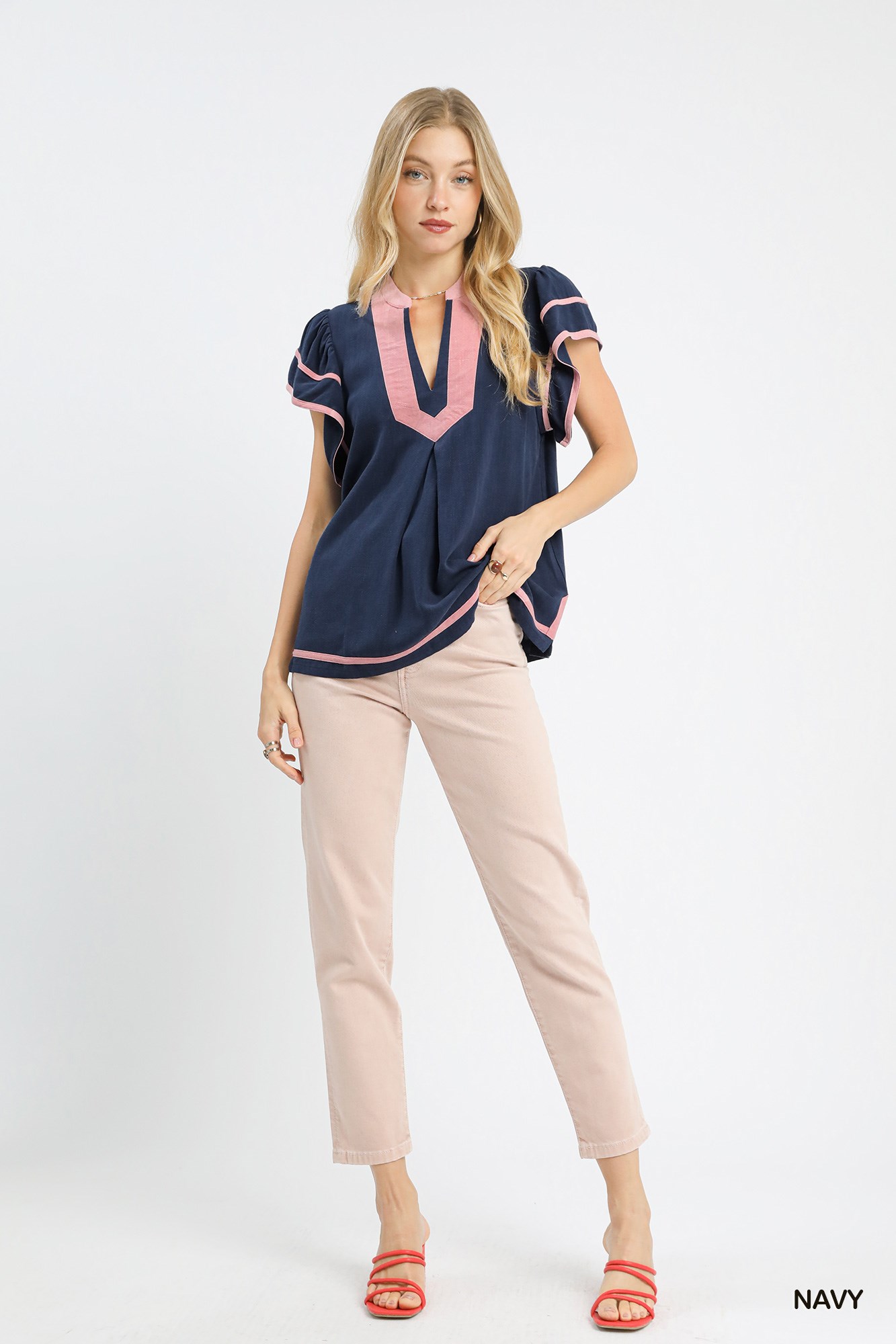 This Linen Ruffle Sleeve Top is a must-have piece crafted from breathable linen fabric, perfect for warm weather days. It features a split V-neck design with contrast trim detail, adding a modern and chic touch to the top. The straight hem with border accent provides a clean and polished finish to the look. This versatile top can easily be dressed up or down for various occasions, making it a wardrobe staple. Please note that this top is not lined, ensuring a lightweight and comfortable feel when worn.