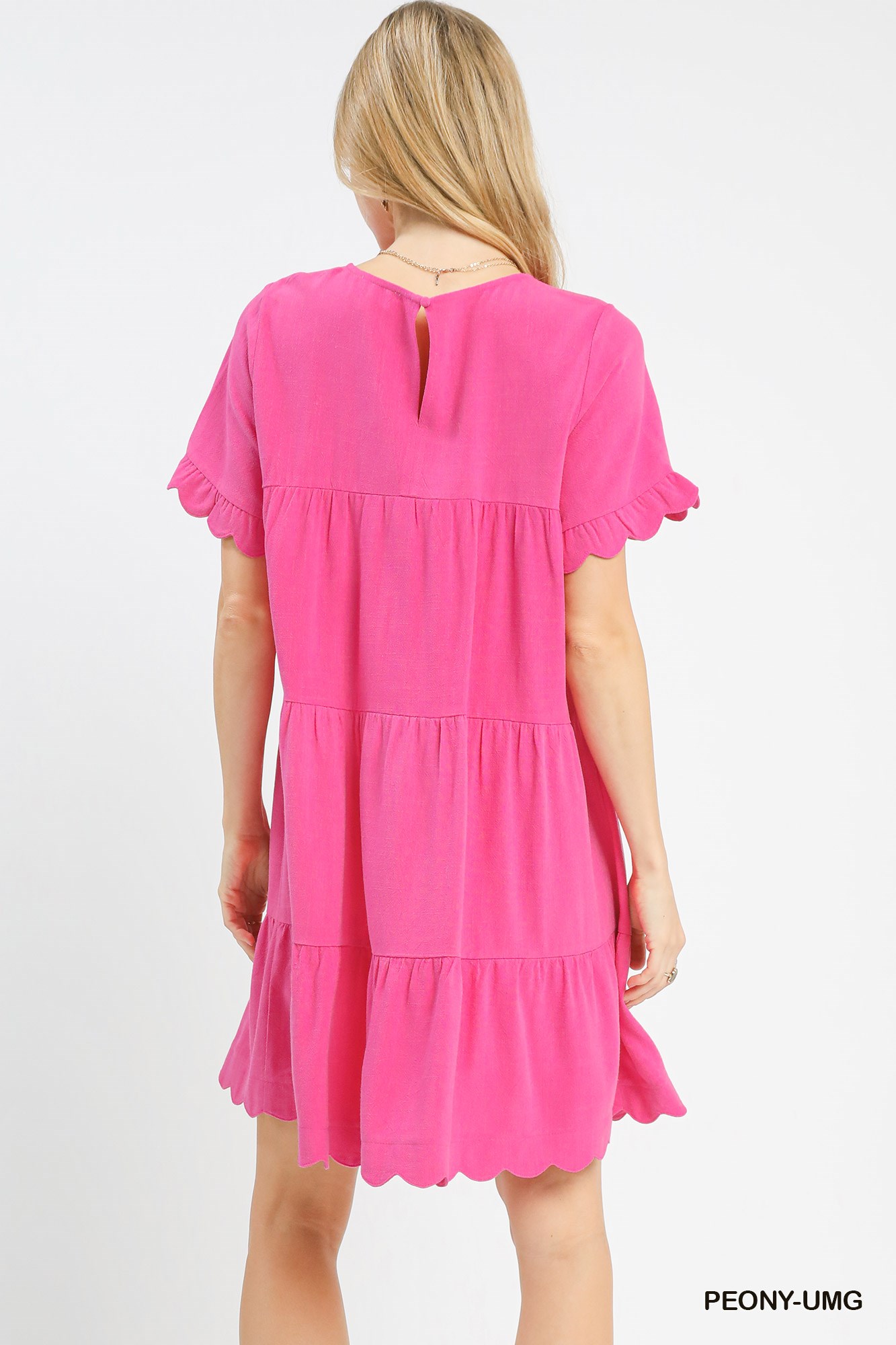 Introducing the Linen Tiered Babydoll Dress in the captivating Umgee color Peony, featuring key details such as a tiered silhouette and ruffle short sleeves for a charming and stylish look. The round neckline adds a classic touch, while the scalloped hem detail offers a unique and trendy element. Crafted from linen, this dress provides a lightweight and breathable feel, perfect for sunny days. With a not lined design, this dress is great for casual outings or dressing up for special occasions. Embrace effortless elegance and femininity with this Linen Tiered Babydoll Dress that combines comfort with chic style in the lovely Peony hue.