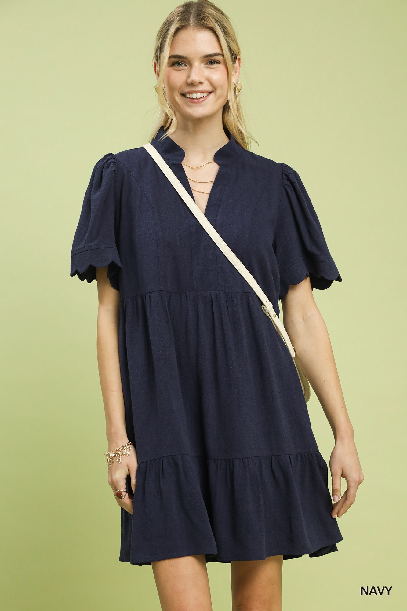 This linen tiered babydoll dress is a versatile and stylish choice, featuring a split V-neck and short scalloped sleeves for a feminine touch. The practical pockets add functionality to the design, while the lining enhances comfort and coverage. Perfect for a casual and effortless look, the dress combines comfort with chic style. The tiered silhouette adds dimension and movement to the outfit, making it a flattering and easy-to-wear option for various occasions. Ideal for a relaxed and fashionable ensemble that exudes charm and comfort.