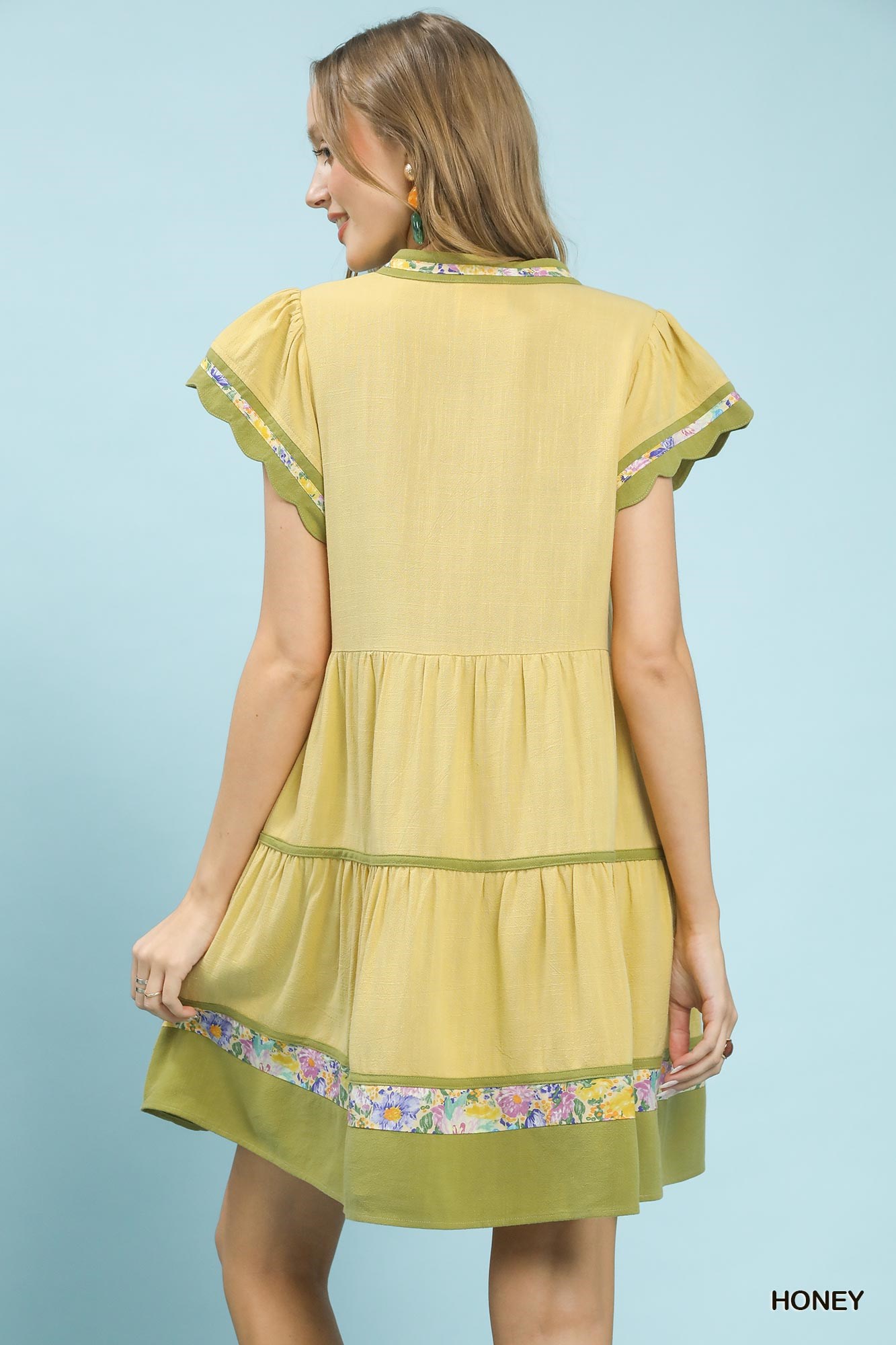 The Linen Tiered Flutter Sleeve Dress with Floral Trim is a charming and elegant choice for warm-weather occasions. Crafted from linen, this dress offers a lightweight and breathable option for sunny days. The flutter sleeves and tiered silhouette add a playful and feminine touch to the design. Featuring contrast floral trim accents and a split V-neck with contrasting details, this dress exudes a stylish and eye-catching appeal. While not lined, this dress maintains its airy and comfortable feel, making it a versatile and chic option for summer outings and events.