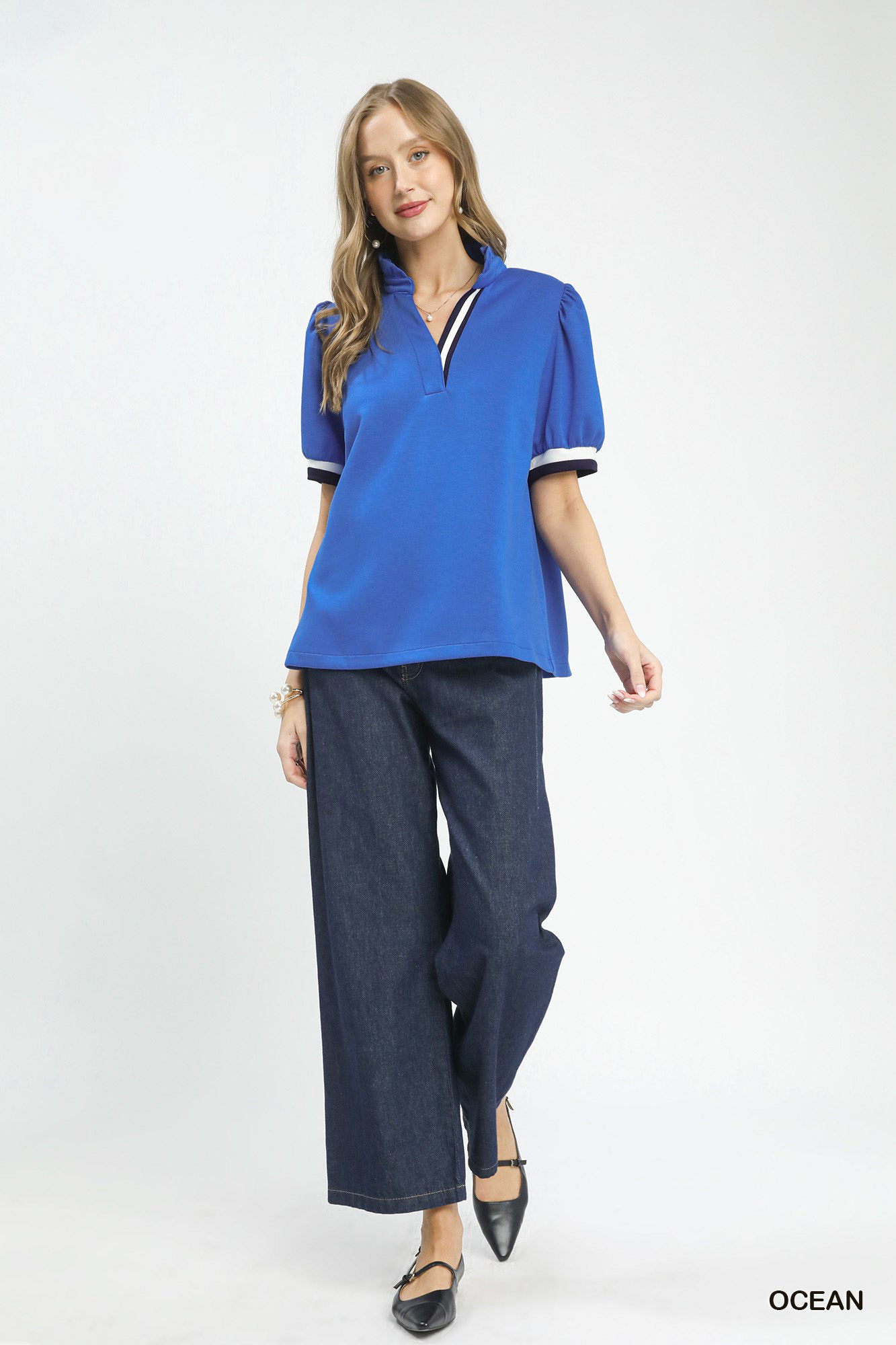 This Luxe Knit Contrast Trim Puff Sleeve Top is crafted from soft, smooth luxe knit fabric that offers a comfortable, flattering fit with just the right stretch. It features elegant contrast trim detailing that adds a refined, eye-catching highlight along the neckline, cuffs or hem. The gentle puff sleeves bring a romantic, feminine silhouette while keeping the overall look polished and modern. With a tailored yet relaxed fit, this top balances comfort and sophistication for daily wear or casual occasions. Easy to pair with jeans, skirts or trousers, it elevates any outfit with subtle luxury and timeless style.