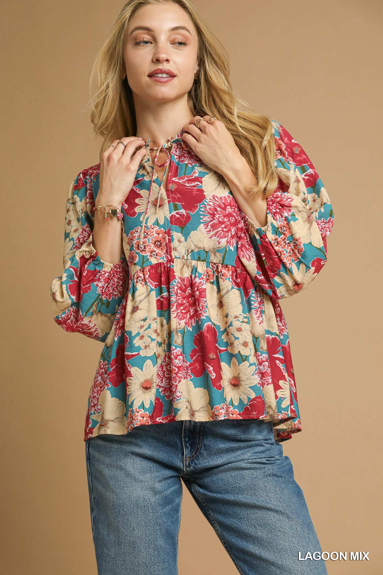 Umgee Mix Floral Peplum Blouse with Tie Neck