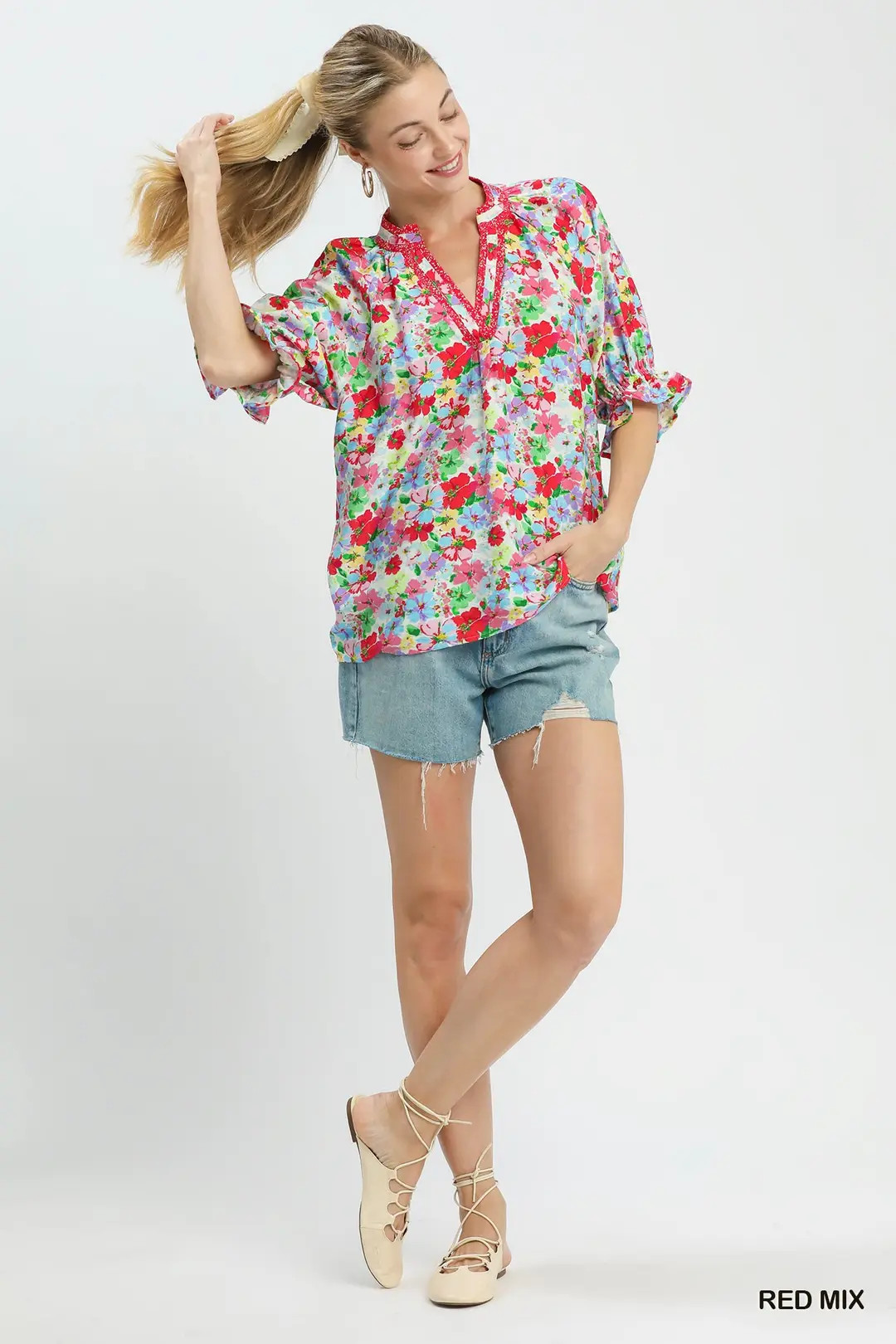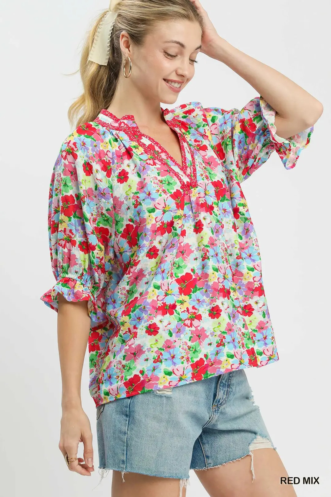 Boasting a charming mixed floral print, this ruffle top blends romantic flair with effortless everyday style. Soft ruffle detailing adds delicate texture and feminine charm, elevating the casual silhouette. Lightweight and breathable fabric ensures all-day comfort, while the versatile design pairs seamlessly with jeans, shorts, skirts and bottoms. A trendy wardrobe essential for brunch, daily outings, vacation and warm-weather casual looks.