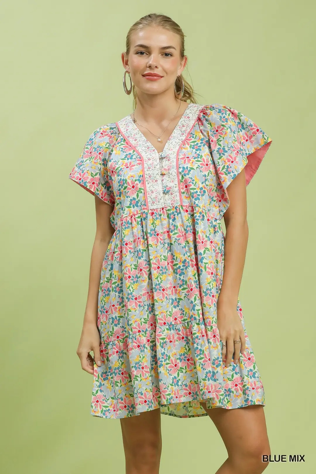 This charming mix floral tiered dress features a classic V-neckline accented with a contrast floral placket, creating a lovely focal point with layered botanical charm. It is designed with a flowy tiered skirt and delicate ruffle hem that adds gentle movement and a romantic finish. The relaxed A-line silhouette ensures comfortable, effortless wear, while convenient side pockets bring practicality to the elegant design. Fully lined for comfort and coverage, this dress blends soft floral aesthetics with everyday versatility, perfect for brunch, garden events, vacations and casual daytime outings.