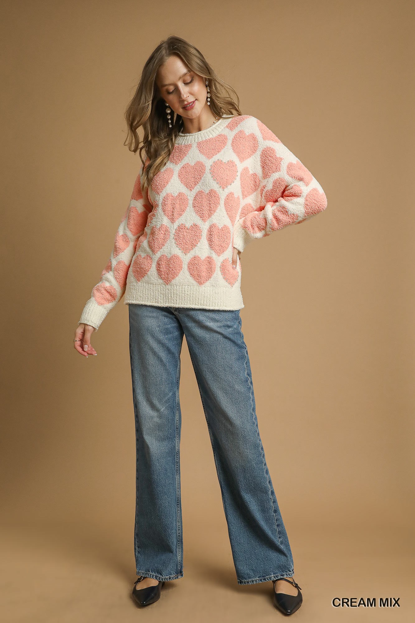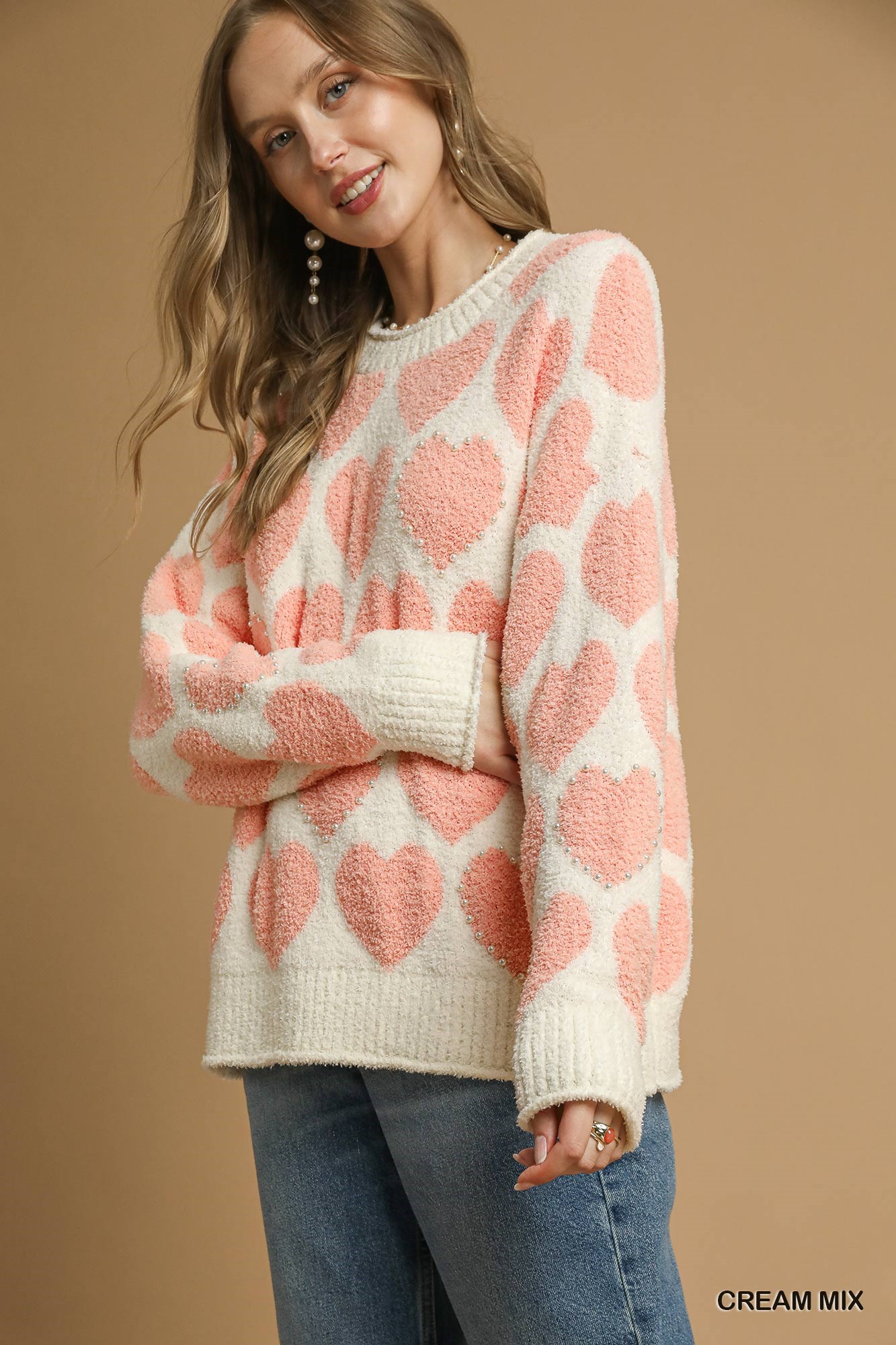 This charming heart pattern pullover sweater features a delightful romantic design with pink hearts on cream background. Made from soft knit material, it offers comfortable relaxed fit with long sleeves and crew neckline. Perfect for casual wear, Valentine's Day, or adding a playful touch to your wardrobe. The cozy sweater combines style and comfort with its eye-catching heart motif pattern.