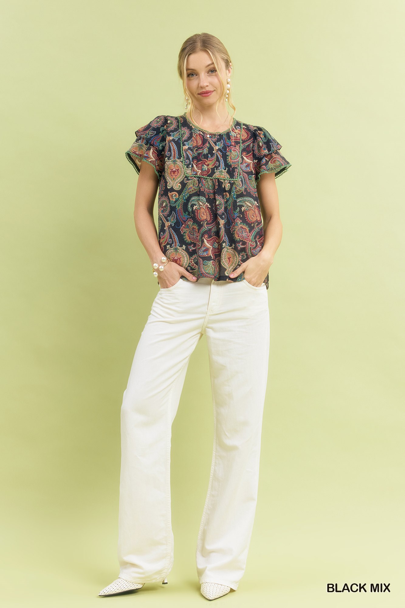 Elevate your wardrobe with the Mix Paisley Ruffle Sleeve Top, a charming and feminine piece for any occasion. The paisley floral mix print adds a touch of bohemian flair to this top. The round neckline features pintuck detail and trim, adding a subtle yet stylish touch. Short ruffle sleeves give this top a playful and romantic feel. Stay comfortable and stylish with the added lining for a polished look. Dress up this top for a night out or pair it with jeans for a casual chic ensemble.