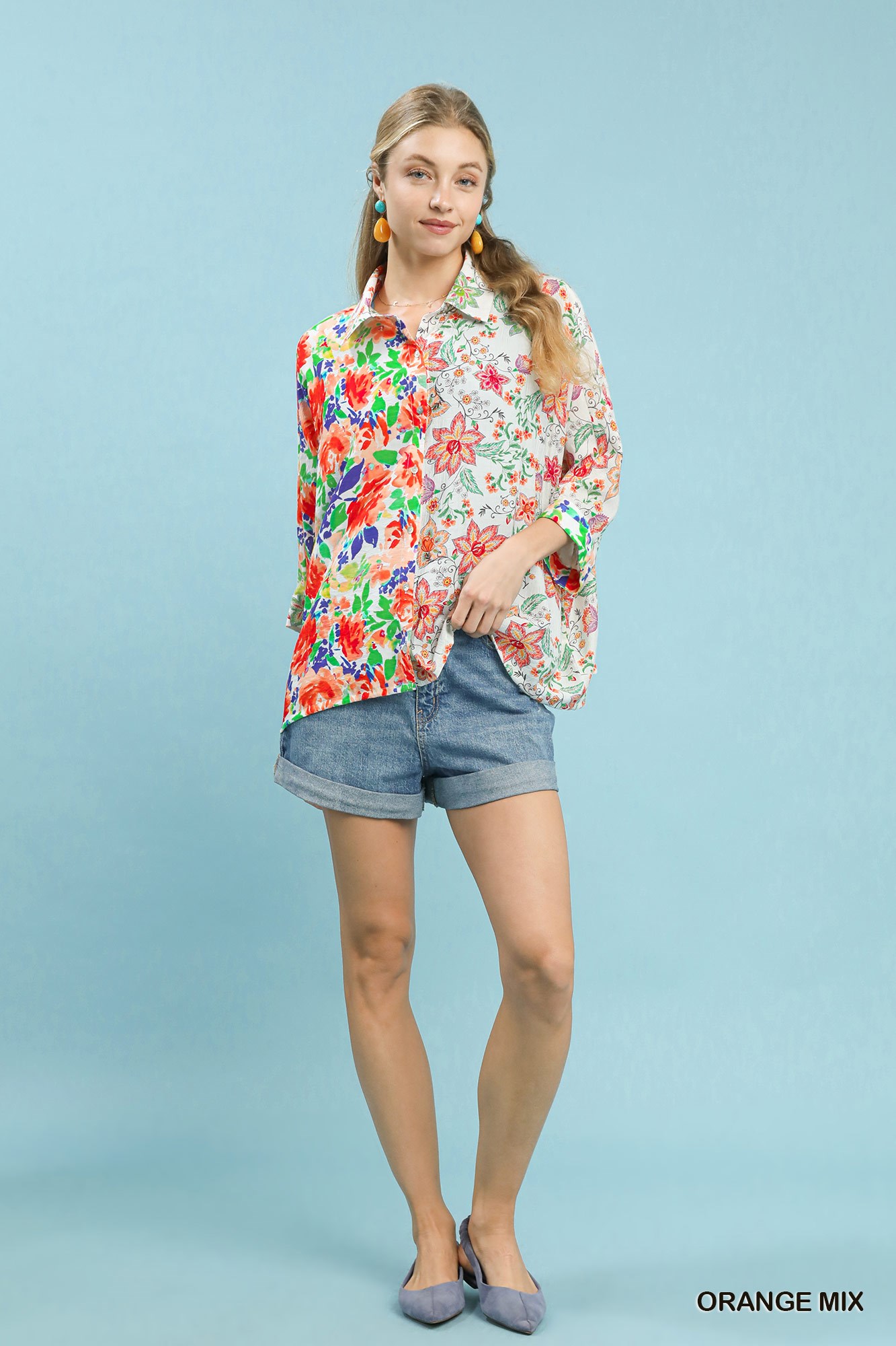 This Mixed Floral Oversized Button Down Top offers a relaxed and chic style with its oversized fit and collared neckline. The button-down front adds a classic touch to the design. Featuring 3/4 length sleeves, this top is perfect for transitional seasons. The contrasting floral print design adds a pop of color and visual interest. Please note that this top is not lined, making it comfortable and lightweight for everyday wear.