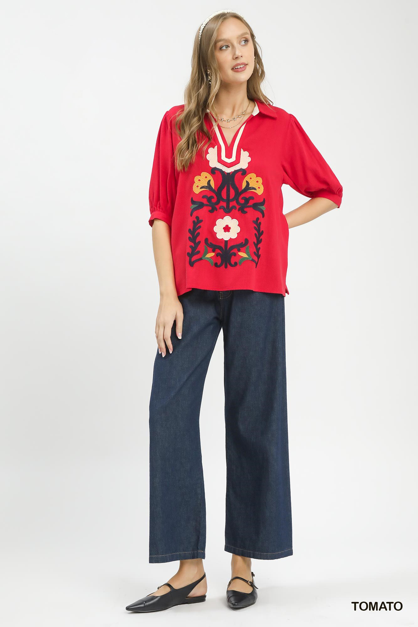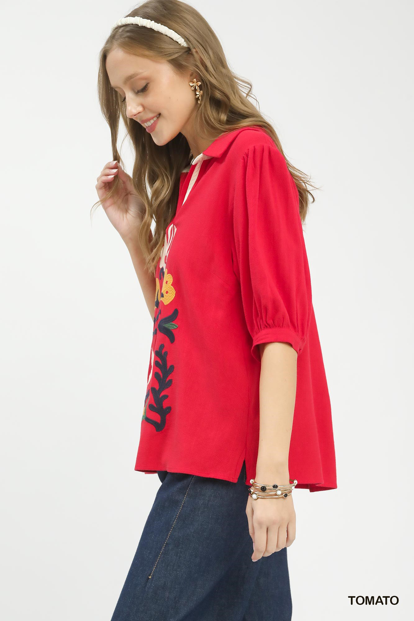 The Mixed Media V-Neck Print Top is a versatile and stylish piece for your wardrobe. Crafted from linen, this top offers a lightweight and breathable feel. The half sleeves with subtle elastic cuffs provide a comfortable and flattering fit. Featuring a split V-neck design and embroidered details, this top exudes a chic and elevated look. Perfect for pairing with jeans or shorts, this top is ideal for both casual and dressier occasions. Elevate your outfit with the sophisticated and on-trend Mixed Media V-Neck Print Top for a fashionable and polished ensemble.