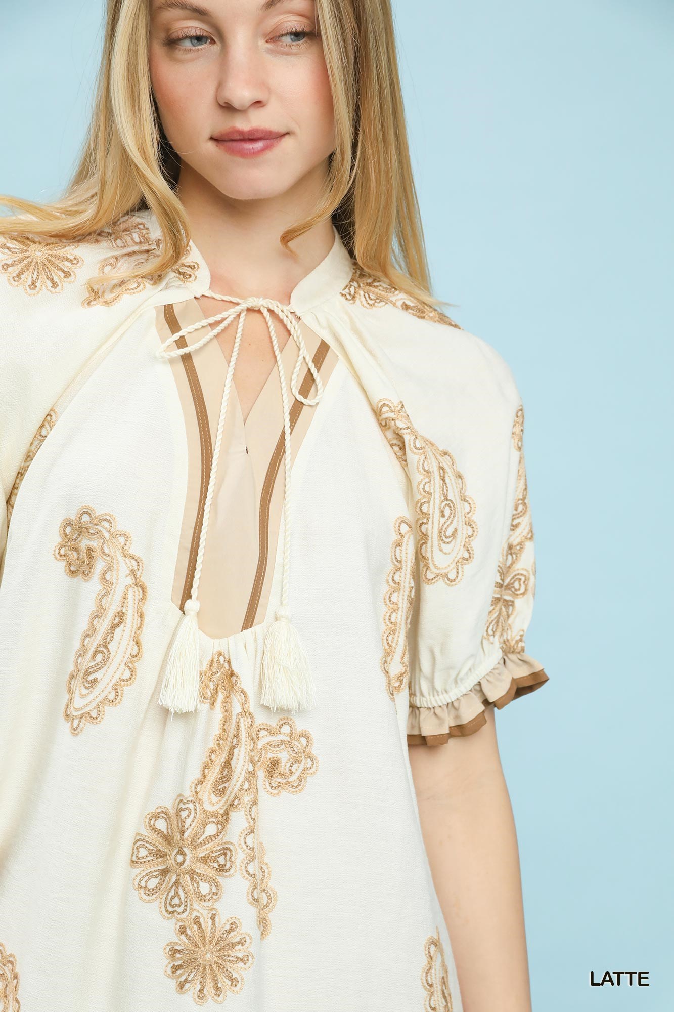 A paisley embroidered short puff sleeve top combines intricate paisley embroidery with on-trend puff sleeves for a stylish and feminine look. The paisley embroidery adds a touch of elegance and texture to the top, creating visual interest. The short puff sleeves add a trendy and playful element to the design, making it a versatile piece for different occasions. This top is perfect for adding a fashionable and chic touch to your outfit, whether for a casual day out or a special event. Overall, the combination of paisley embroidery and puff sleeves in a short top creates a beautiful and on-trend ensemble that is both eye-catching and elegant.