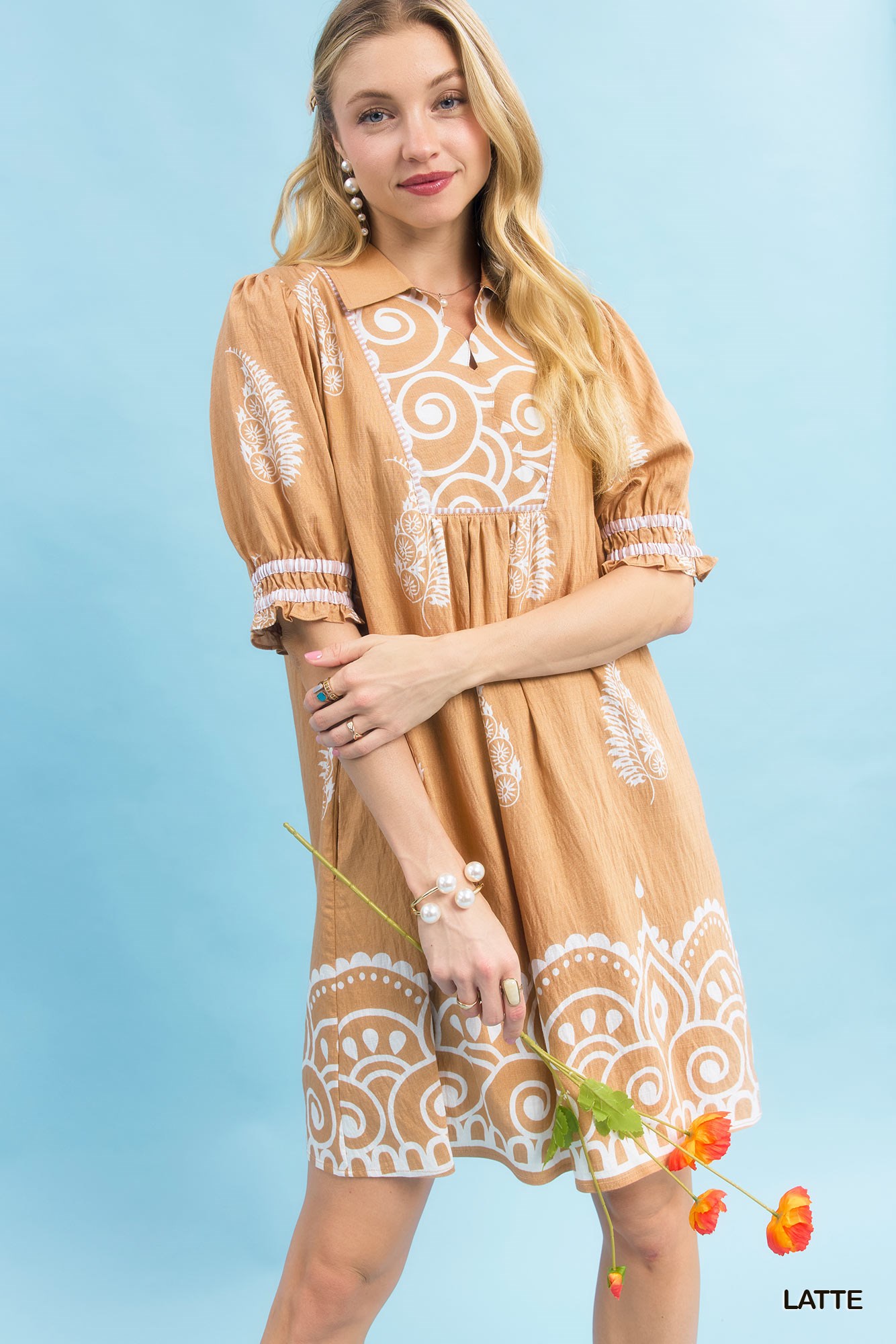 This Paisley Mandala Print Babydoll Dress features an eye-catching paisley mandala print design. Its babydoll silhouette and scalloped yoke give it a unique and playful look. The collared neckline and short puff sleeves add a touch of elegance to the overall style. With a border print at the hemline, this dress offers a subtle yet chic detail. It is also lined for added comfort and quality.