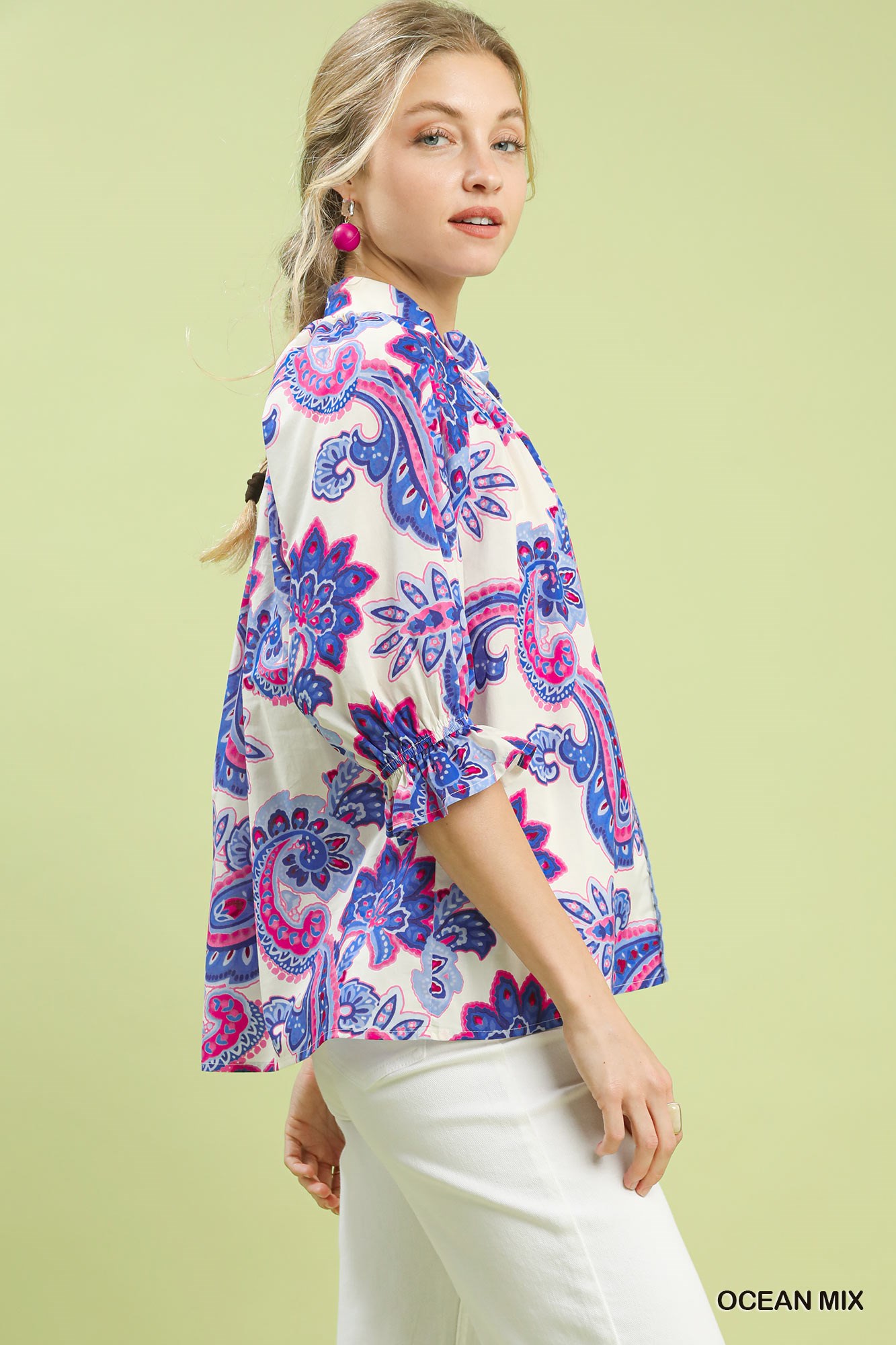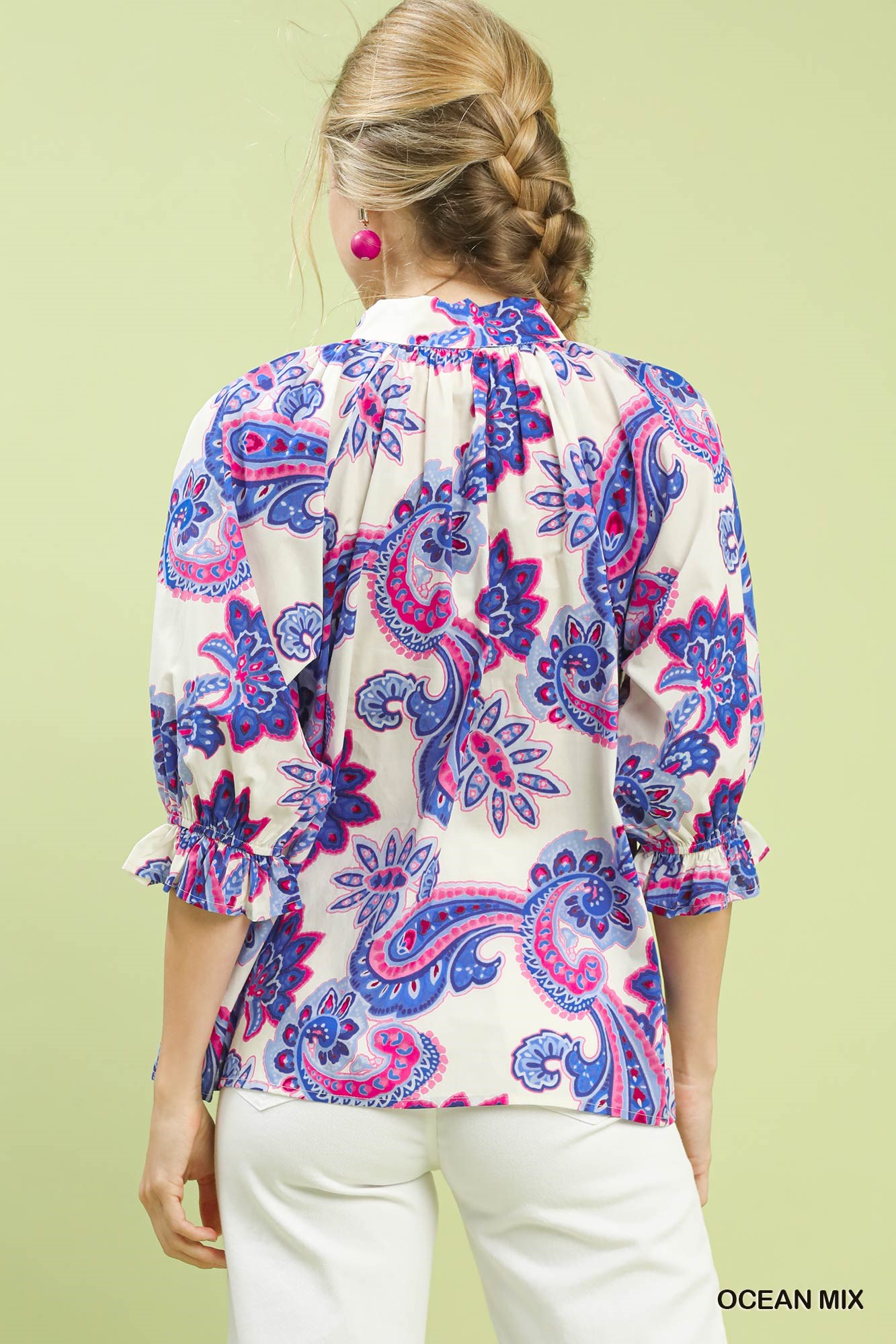 This Paisley Print Button Front Top is a charming addition to your wardrobe with its button-front closure for easy wear. The scallop trim detail adds a touch of elegance and femininity to the design. Featuring 3/4 puff sleeves, this top offers a stylish silhouette that is both comfortable and chic. It is not lined, allowing for breathability and a lightweight feel. Perfect for pairing with jeans or trousers, this top is versatile and can be dressed up or down for any occasion.