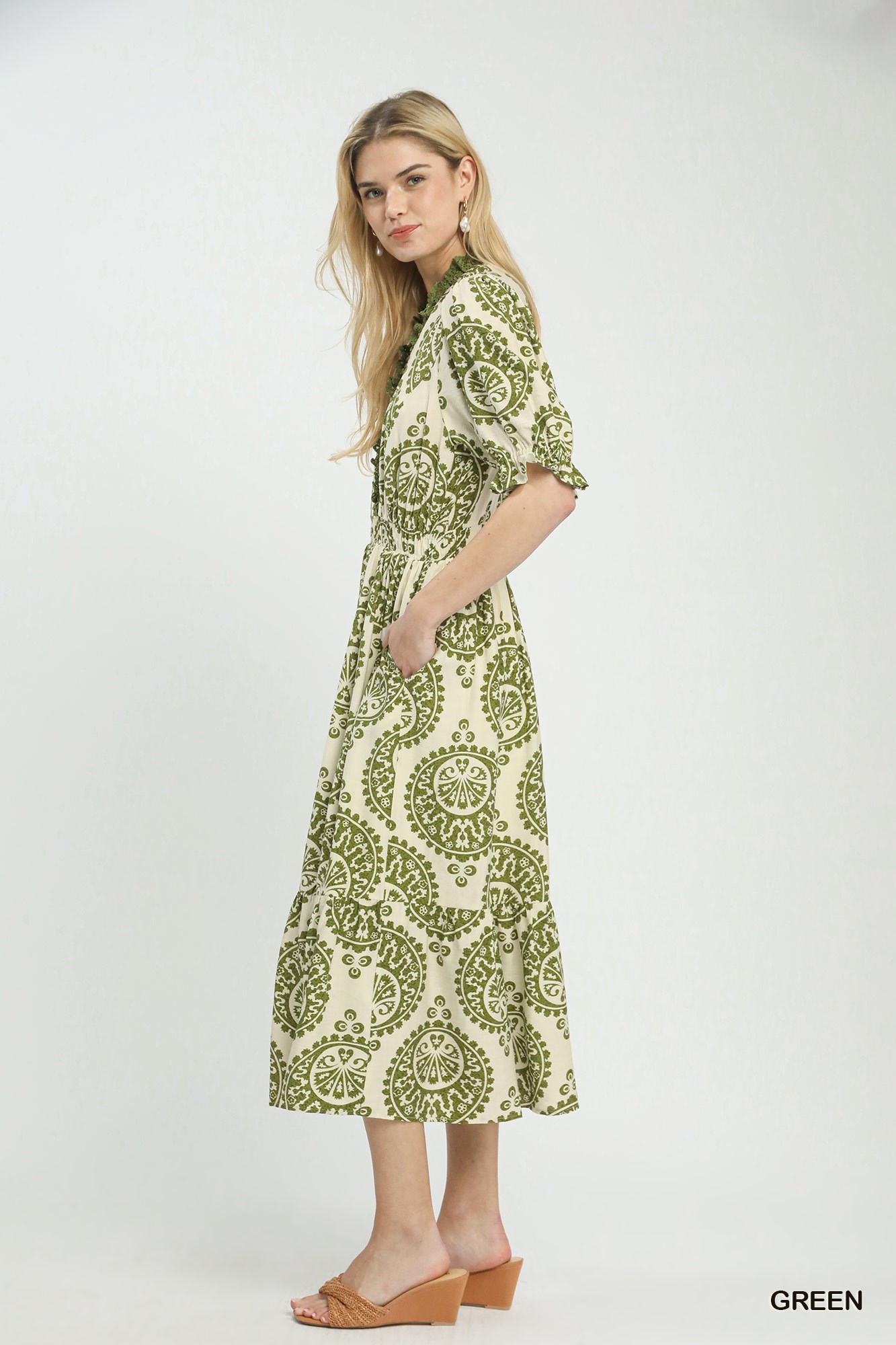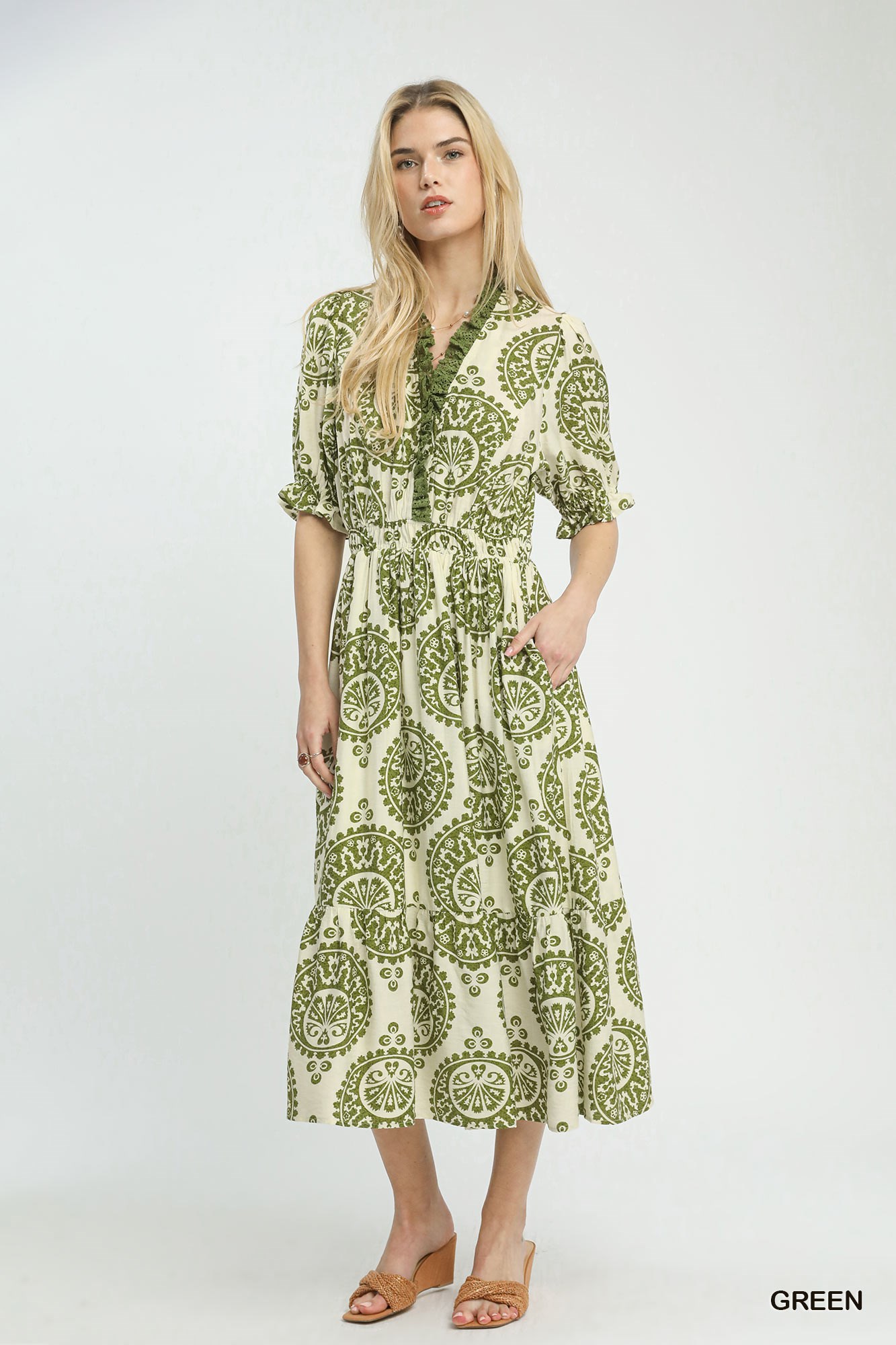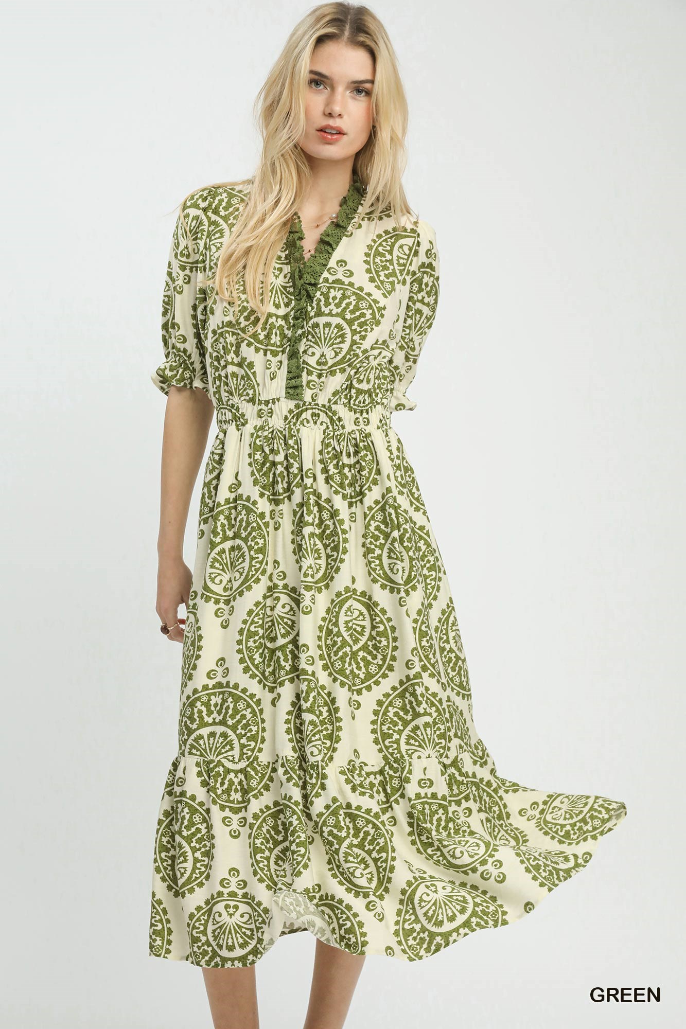 The Paisley Smocked Waist Midi Dress is a chic and versatile piece featuring an allover paisley medallion print for a bohemian touch. This dress is designed with a split V-neck adorned with lace trim detail, adding a delicate and feminine accent. The smocked elastic waist ensures a comfortable and flattering fit, emphasizing the waistline. With a midi length and a skirt lined for coverage, this dress strikes a balance between style and functionality. Elevate your look with this dress that combines intricate lace trim and elegant paisley patterns for a charming and stylish ensemble.