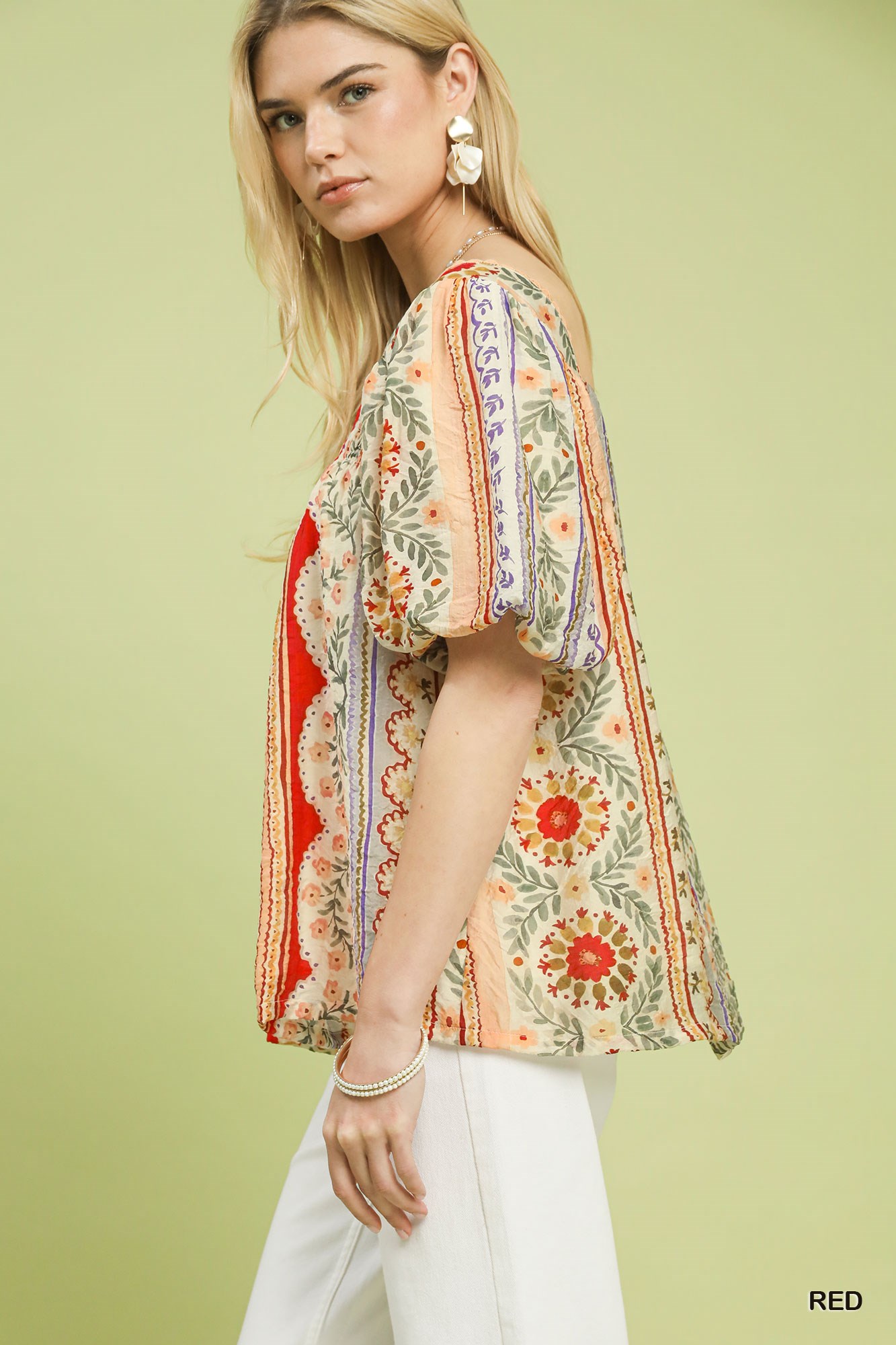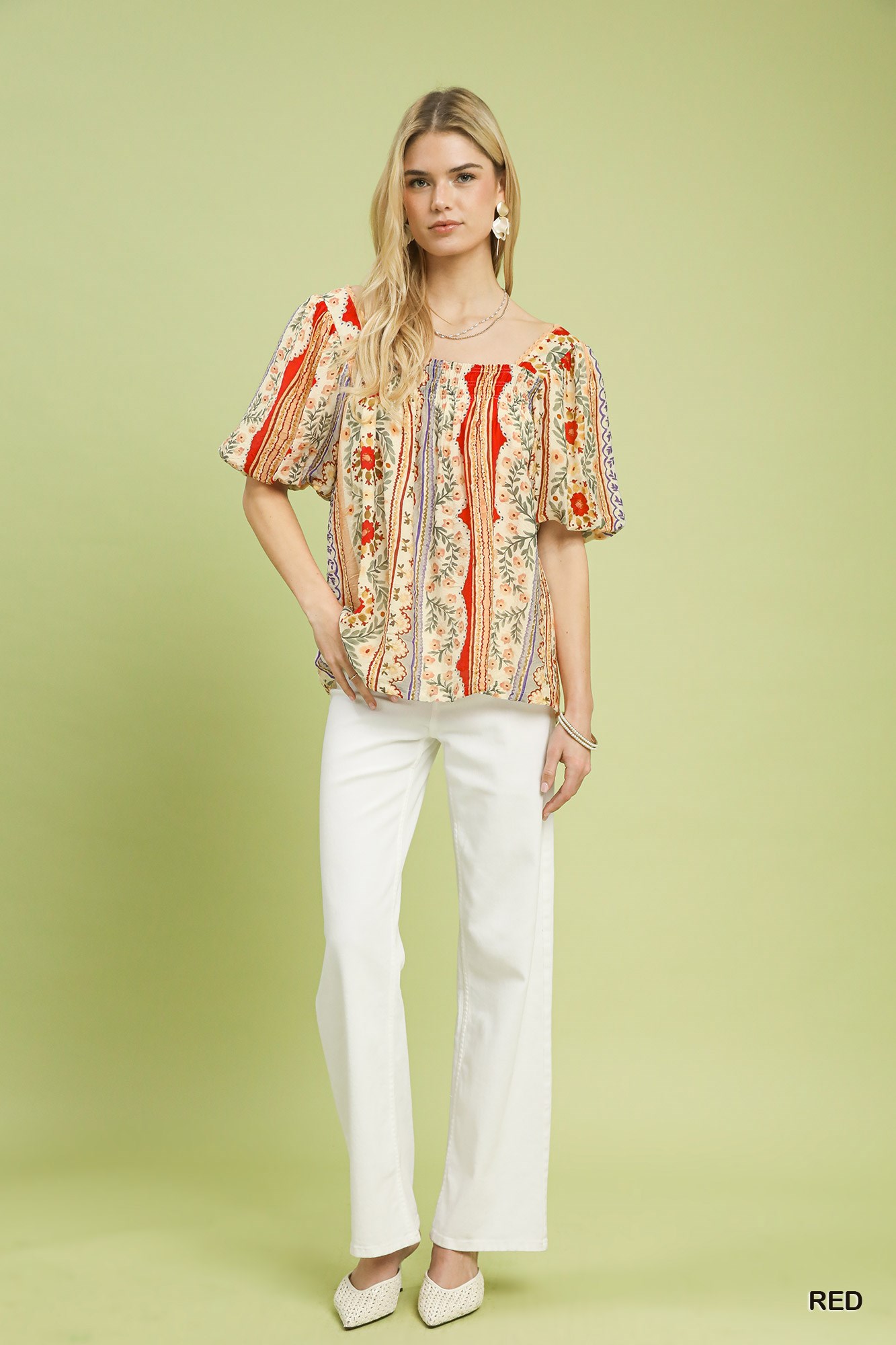 Umgee Patchwork Puff Sleeve Smocked Blouse