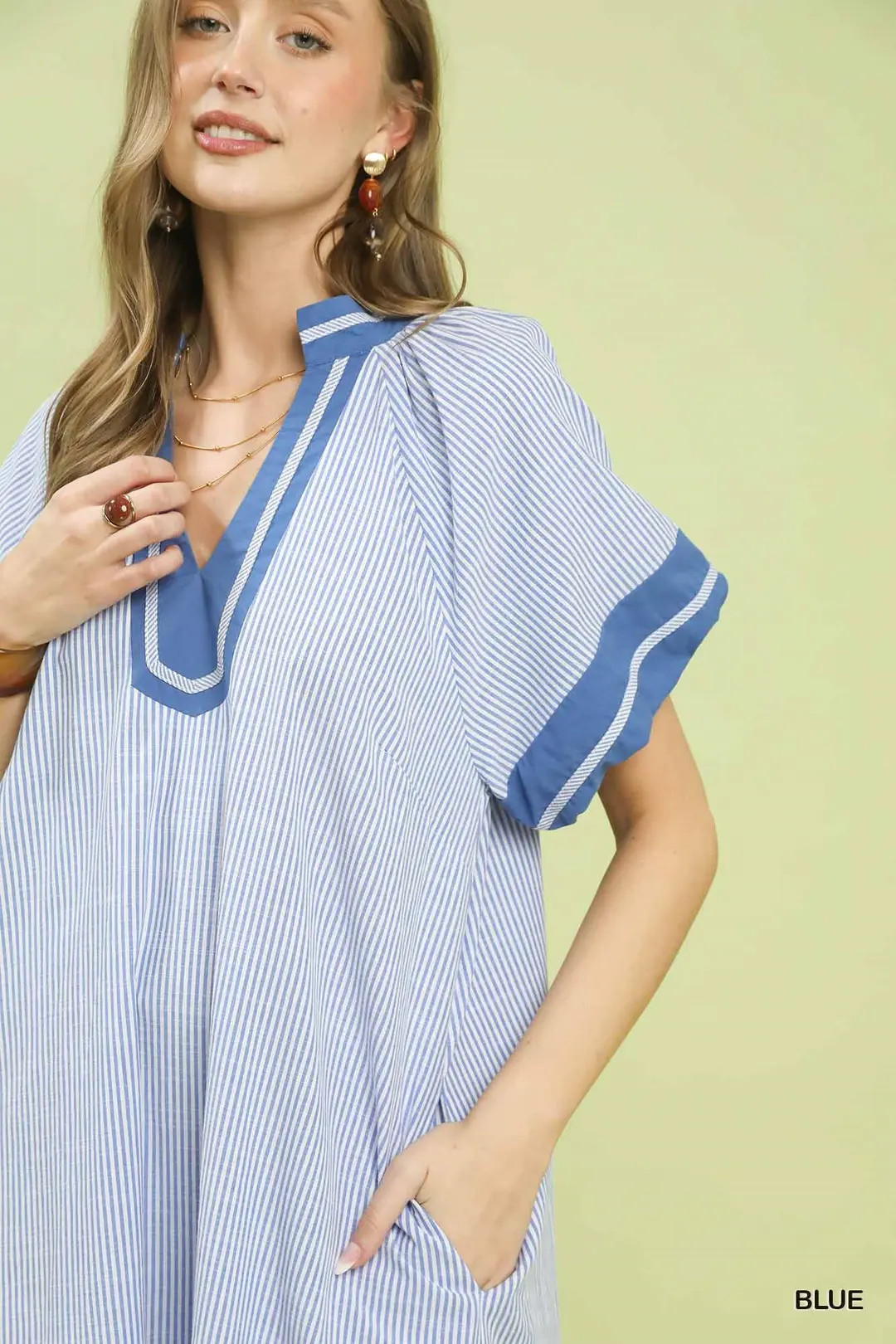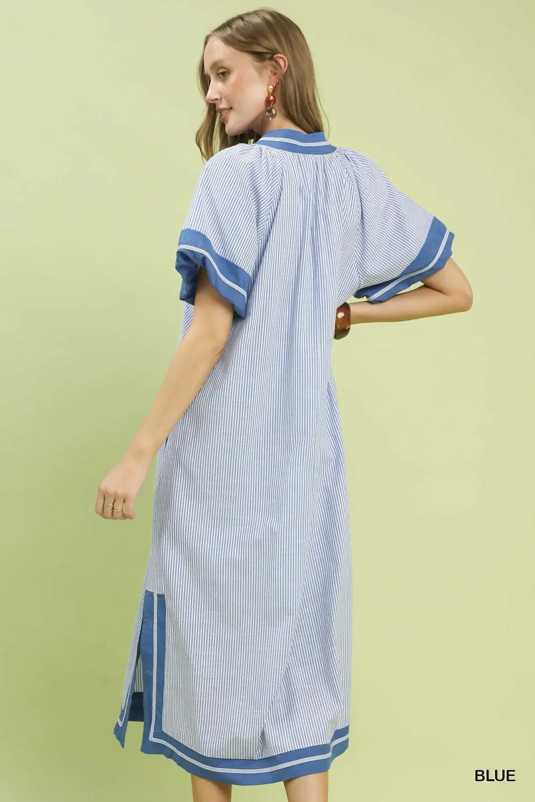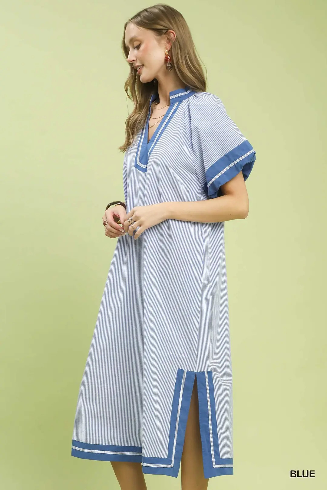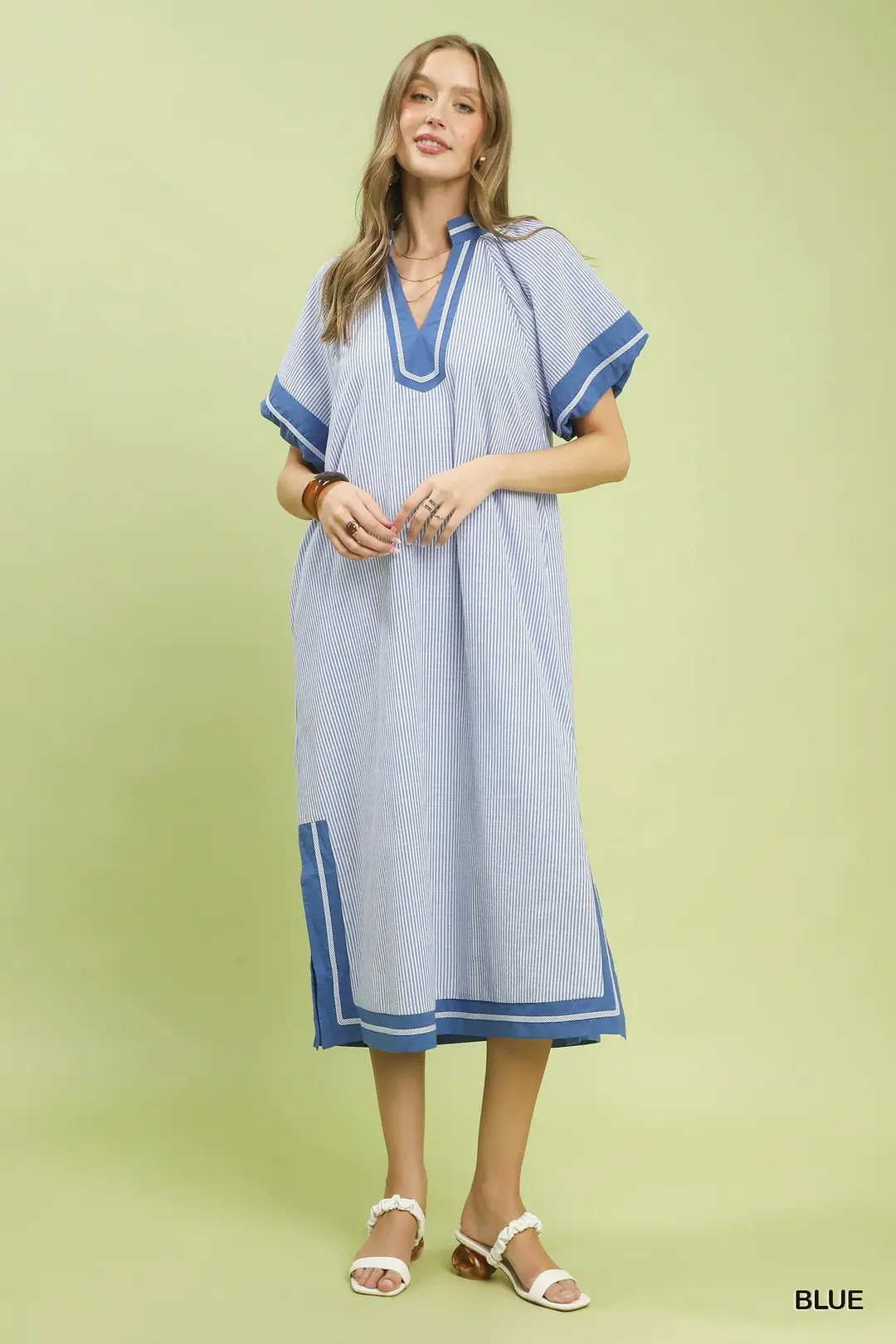 This timeless midi dress showcases a refined pinstripe pattern that brings a sleek, polished touch to any look. It features a flattering split V‑neck accented with bold contrast trim for a sharp, eye-catching detail, paired with relaxed short dolman sleeves for effortless comfort and flow. Designed with practical side pockets and fully lined for softness and coverage, the dress falls elegantly to midi length, balancing sophisticated style with everyday functionality. Ideal for casual gatherings, brunch, office-friendly looks, and warm-weather occasions.
