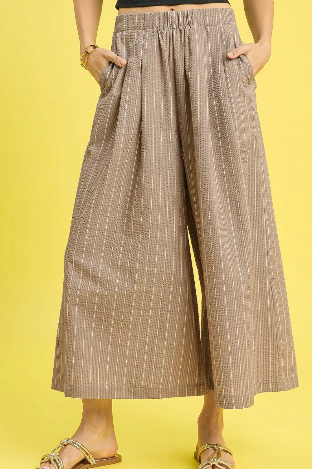These Umgee Pinstripe Crop Palazzo Pants feature a sophisticated pinstripe pattern in a neutral taupe colorway, crafted from lightweight woven fabric for comfortable all-day wear. The wide-leg palazzo silhouette offers a relaxed, flowing fit that flatters all body types, while the elastic waistband ensures comfortable wear without sacrificing style. The cropped ankle length adds a modern touch, making these pants perfect for both casual and semi-formal occasions. Functional side pockets provide convenience, and the pull-on design makes them easy to style. The breathable fabric construction and loose fit make these pants ideal for warm weather, while the classic pinstripe pattern adds timeless elegance to any wardrobe.