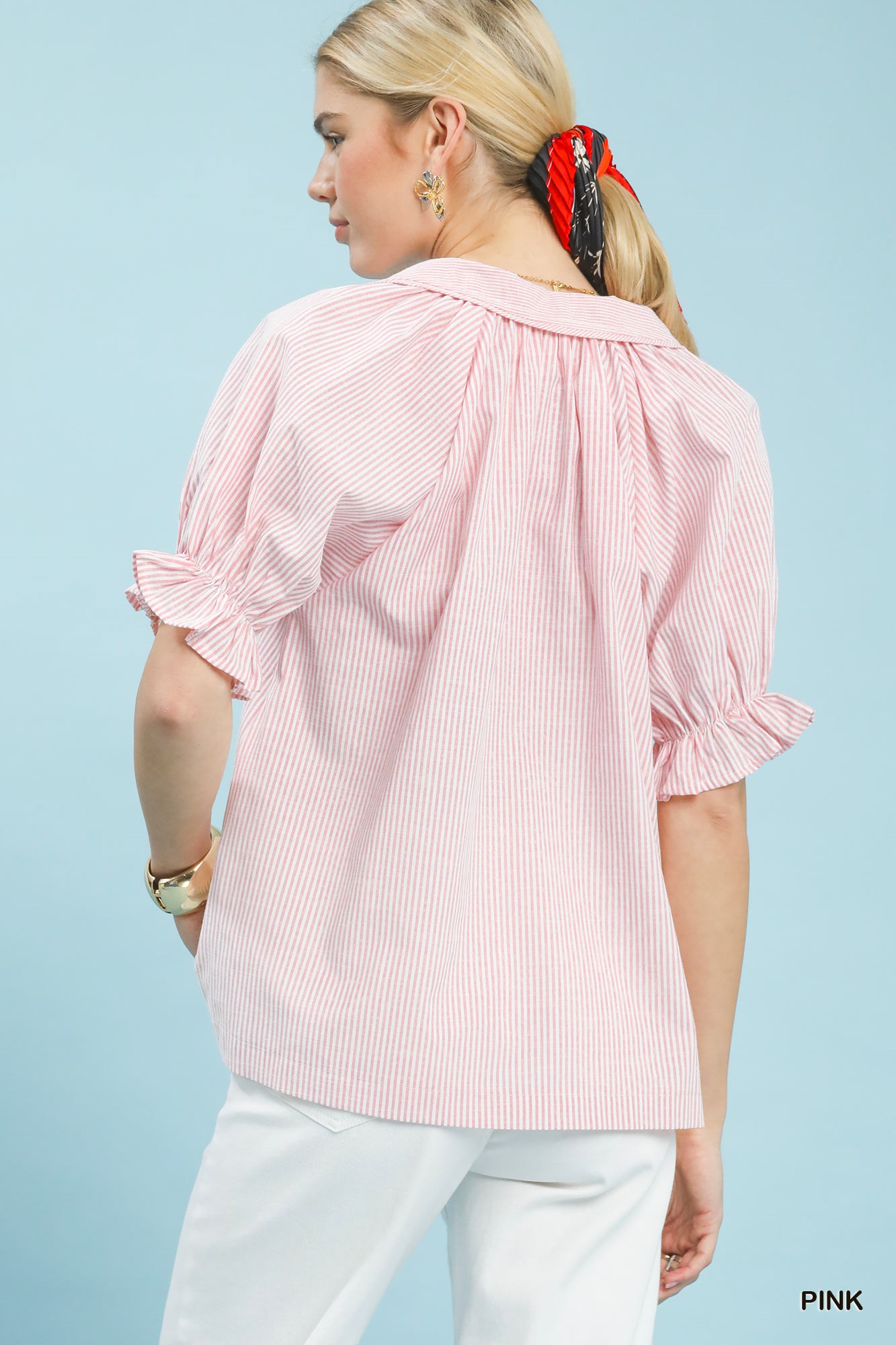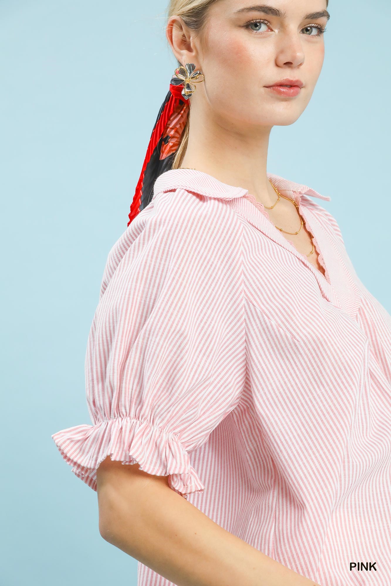 This Pinstripe V-Neck Ruffle Sleeve Blouse features a classic pinstripe pattern that brings a refined, tailored touch to any ensemble. It has a flattering V-neckline that elongates the silhouette, paired with delicate ruffle sleeves for a soft, romantic contrast. Made from lightweight and breathable fabric, it ensures all-day comfort with a smooth, flowy drape. The relaxed fit makes it versatile for both office wear and casual daytime outings. Easy to style with trousers, skirts, or jeans, it effortlessly blends timeless sophistication with feminine charm.