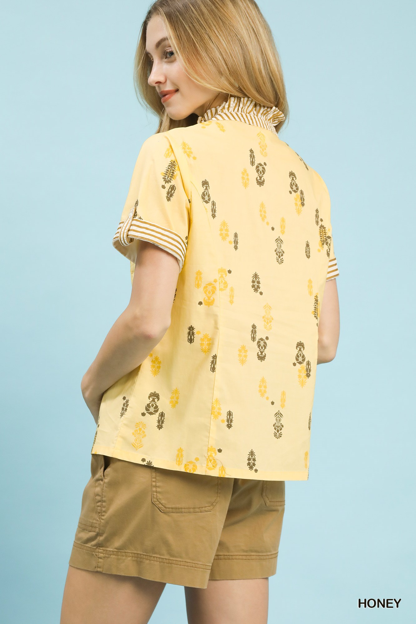 The Printed Ruffle Trim Button Front Blouse boasts a stylish and feminine design with key features that elevate its charm. The ruffled stand collar adds a touch of elegance and sophistication to the blouse. The button-down placket offers a classic and polished look for easy wearing. Short sleeves provide a breezy and comfortable feel, perfect for warm days. The striped ruffle trim detail adds a playful and whimsical element to the overall design. This blouse is not lined, allowing for a lightweight and breathable wear throughout the day.