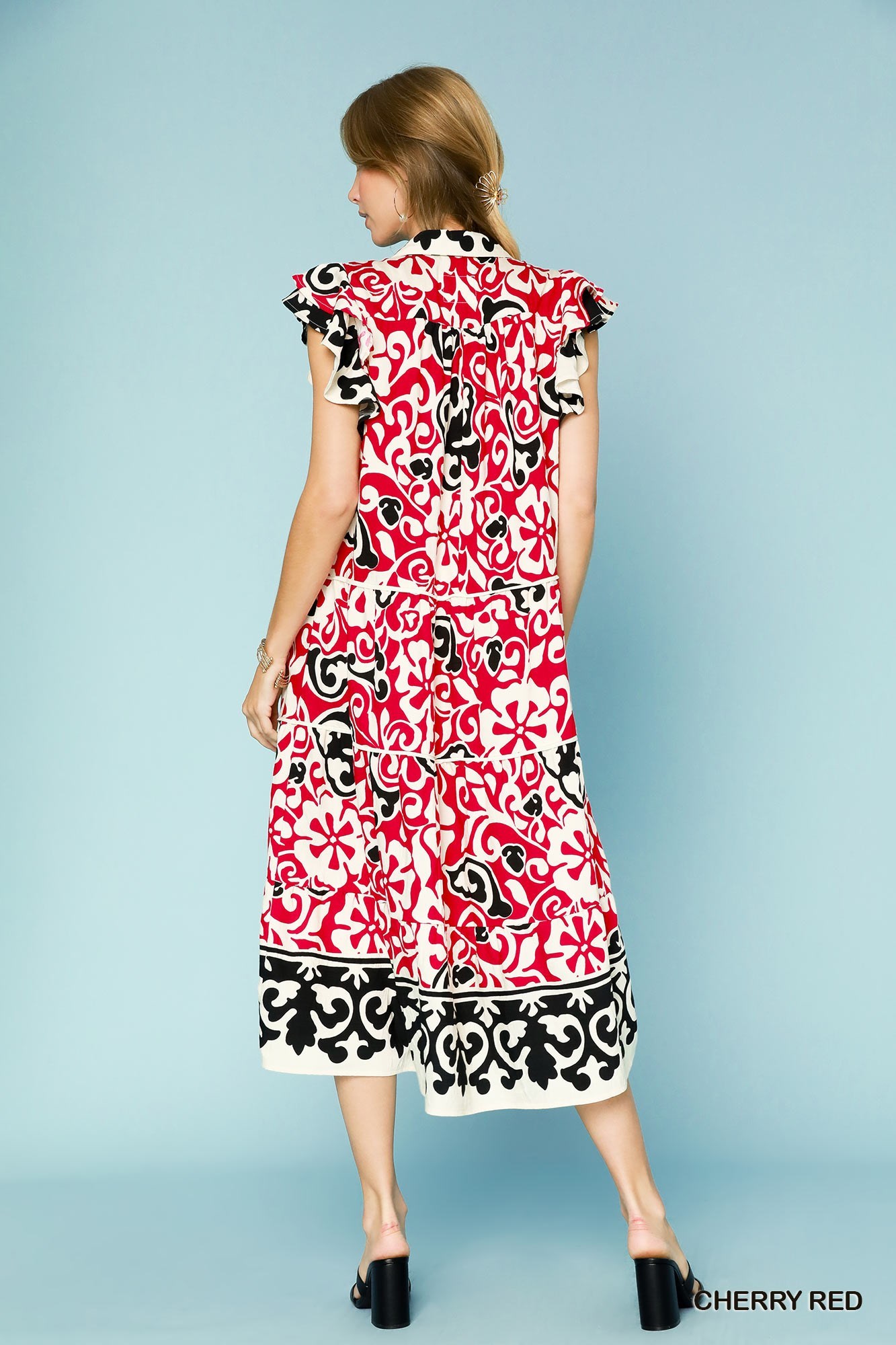 This stunning boho-inspired midi dress features a vibrant floral print in red and black tones with contrasting border trim. Made from comfortable lightweight fabric, it showcases charming ruffle cap sleeves and a flattering V-neckline. The relaxed fit and midi length make it perfect for casual outings, vacation wear, or summer events. The bohemian aesthetic combined with the bold pattern creates a stylish and comfortable piece that stands out in any wardrobe.
